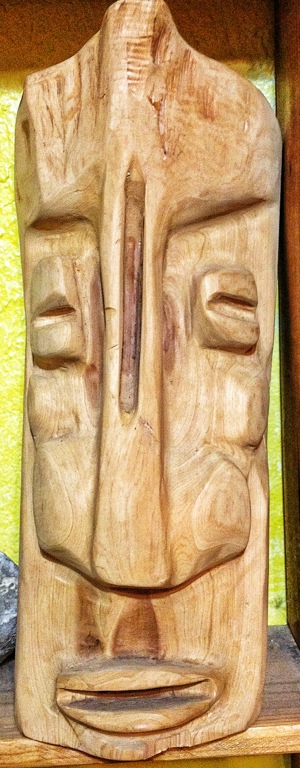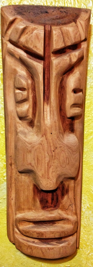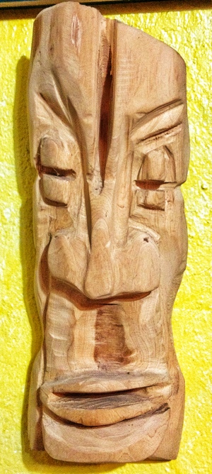 This is one of a series I did with red cedar I found after the hurricanes a couple of years back. They are in the “tiki” style. This I consider a mask. It hangs on the wall