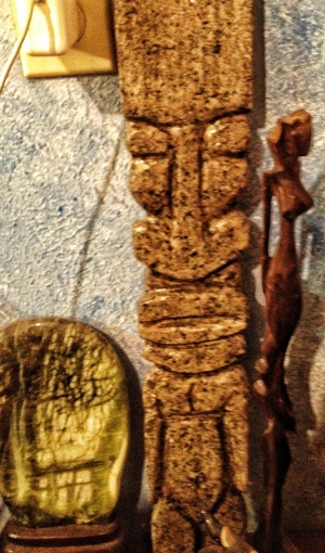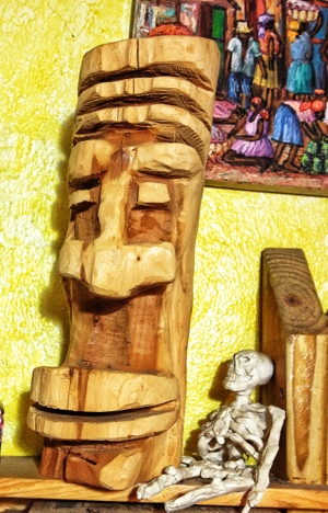 This one is a full tiki, it sits. It’s kinda funny looking too. The skeleton is from a project I helped my son with and the painting is one I purchased from Nassau.