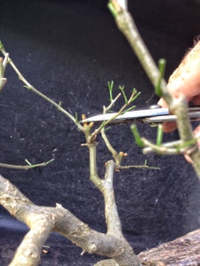 So,what I did was basically cut out the branches going up or down or growing out of the branch crotches. I pruned for taper in some places and simplified where 3 or more buds were coming from the same spot.