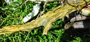 First I used a wire brush to clean it a bit and then painted full strength lime sulfur onto it. Wonderful smell. Maybe they should have banned it.