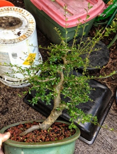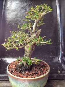 I retrimmed it and repotted it into this blue glazed pot. The tree really needs an oval but I didn’t have one at the time.