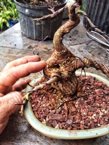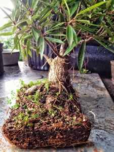 A note on the roots. This is the absolute latest I will be working on tropical plant roots. It is late August or early September (I’m in Orlando. In the north, it may be a good stopping point in mid August.). The roots of a ficus act as sugar storing organs. Hence the reverse taper they show. (a root usually will be fatter at the trunk and taper to a point.)A ficus, more often than not, will be almost shaped like an eye. Thin at the trunk, fattening in the middle, and then tapering to a point. This organ holds the sugar reserves and, when we trim them, we make the tree work harder to make up for the lost sugar. If you root prune too late in the year the tree won’t have enough time to recoup, and it could die. All this is moot, of course,if one has a heated greenhouse where the nighttime temps won’t go below 60 degrees Fahrenheit/15 Celsius. That’s the magic number for root growth. I’ll be in the 70-80’s until November. You should give at least a months growing time after root work for those roots to recover before winter (or summer. Some trees go dormant in the summer when root temps are too high. And if you cut those roots off they won’t grow back and the tree dies)
