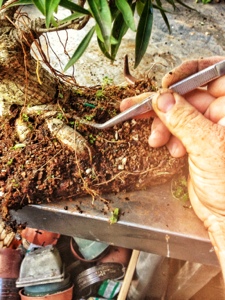 If I wasn’t potting the tree, I would be be using tweezers to weed. They are actually easier. I’ve seen people use chopsticks too. If I want to show off I’ll use them.
