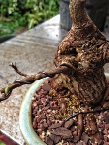 There is some scarring from wire that was left on too long. If we wrap the wire so that it crosses those scars it will help mitigate them when the branch thickens.