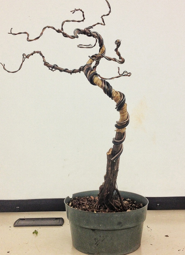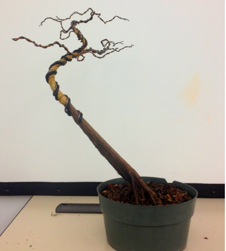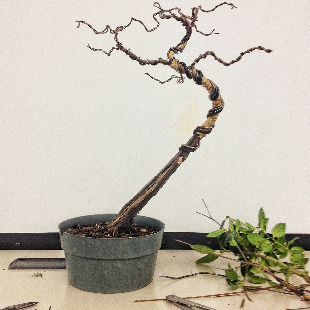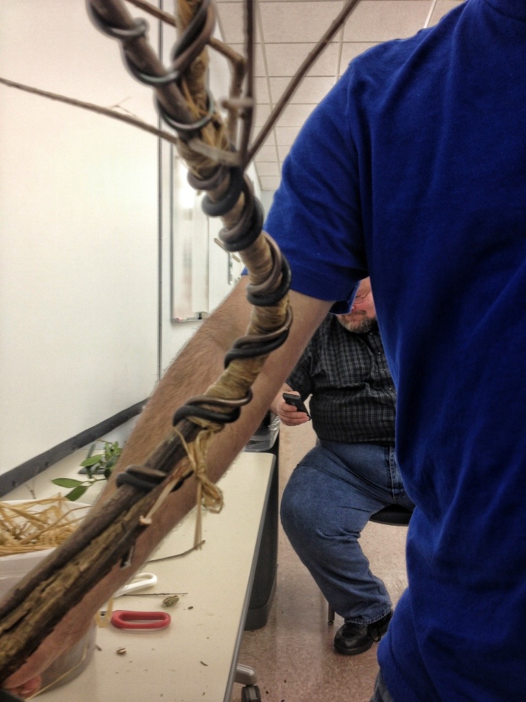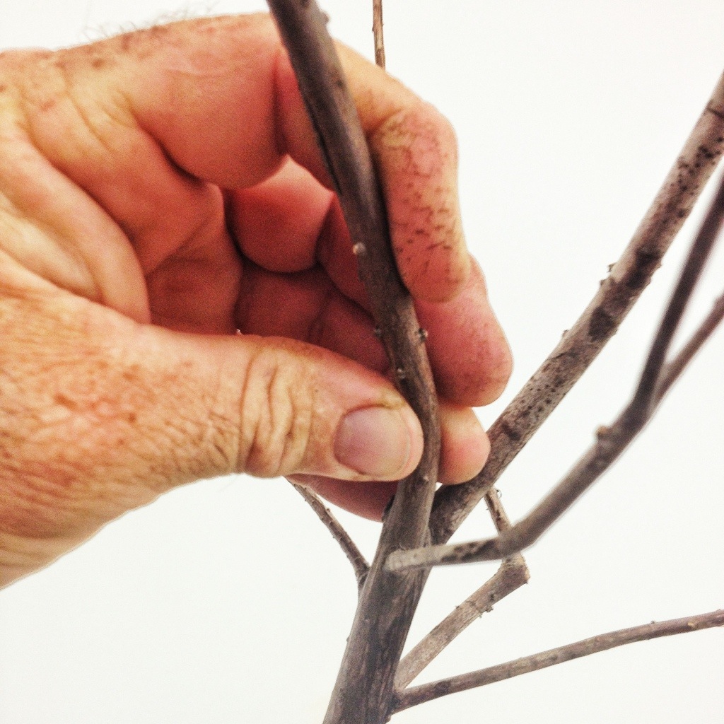Making sure that there aren’t any gaps, bind the wet raffia around the branch/trunk that needs bending.