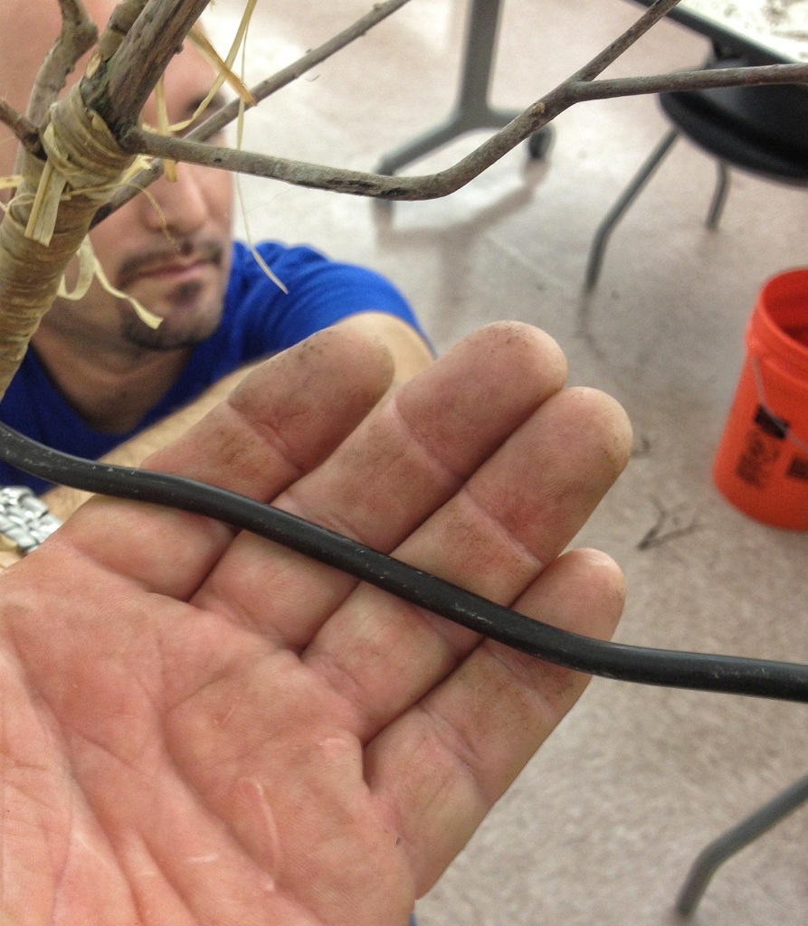 Peter Tea’s master uses a type of grafting tape. Pedro Morales uses a type of foam tape. You don’t have to use raffia, you can probably use duct tape if you want. The principle is this. The outside of a bend has tension. If you put something on the top of the bark, it (the bark) will now be compressed. The compression holds the bark together.