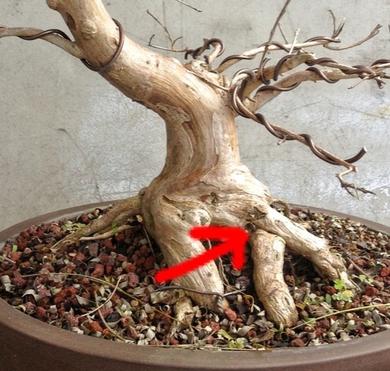 This root is actually coming underneath from behind. It will eventually fuse (I may need to cut the bark where they meet and help it along) but for the moment I need to hide it. Patience