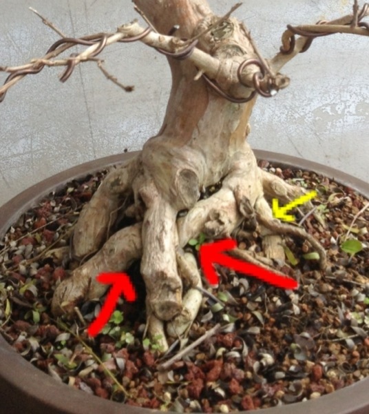 The yellow arrow points to an area that just needs cleaning up. I’ll trim off the dead roots, and some crossing ones.