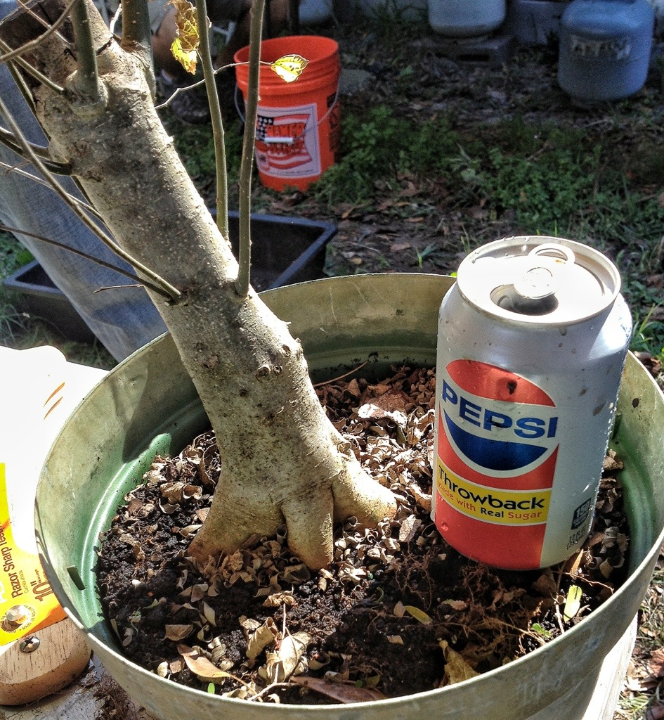 Here’s Dave’s new hackberry (Celtis species) with a little Throwback Pepsi product placement.