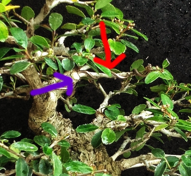 I cut it back (blue arrow) and wired a secondary branch into its old spot (red arrow). As your tree ages, it’s important that this process is done regularly. Taper is the one of the things that give age to a tree. By cutting back and re-growing taper is achieved.
