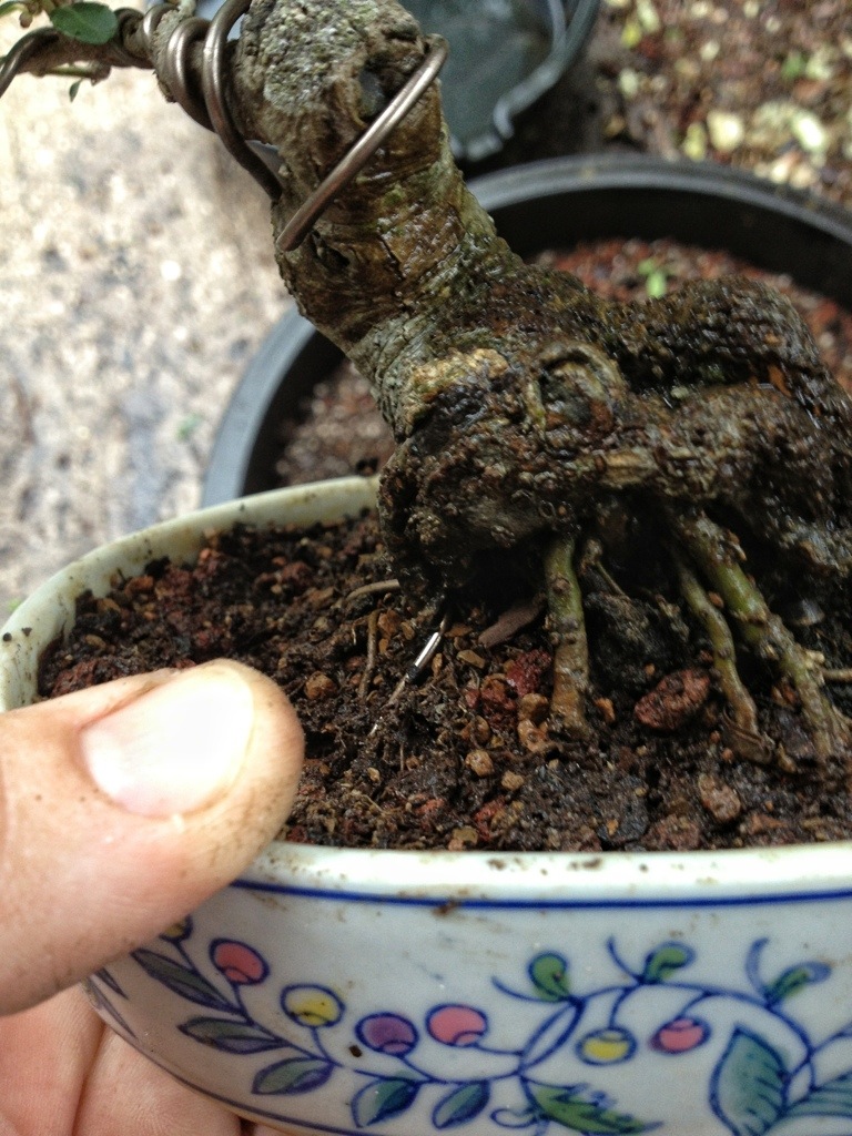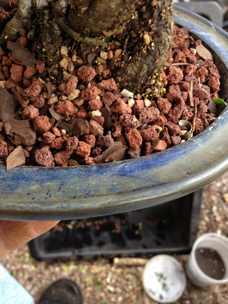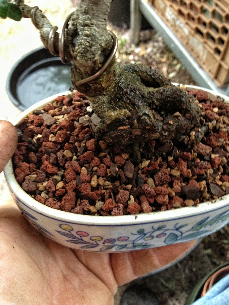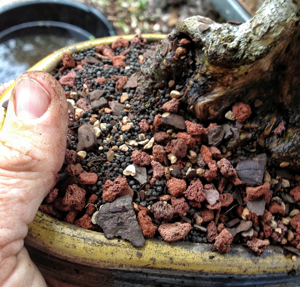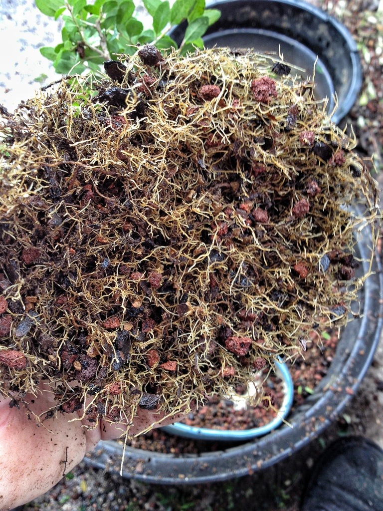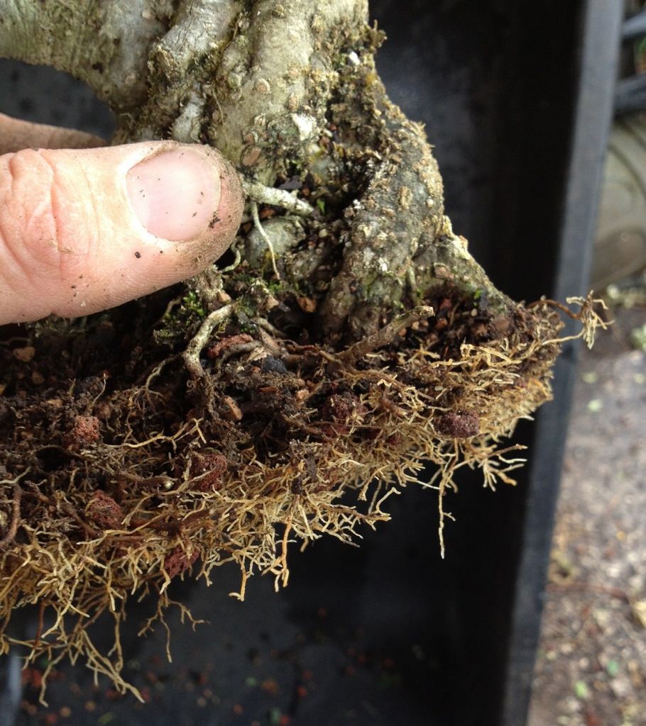 It’s important to understand that we don’t need to be repotting our trees every year. Each time you do it some vigor is sapped away from the tree. The soil in this pic above is not showing too many roots (an ilex roots will fill the pot)