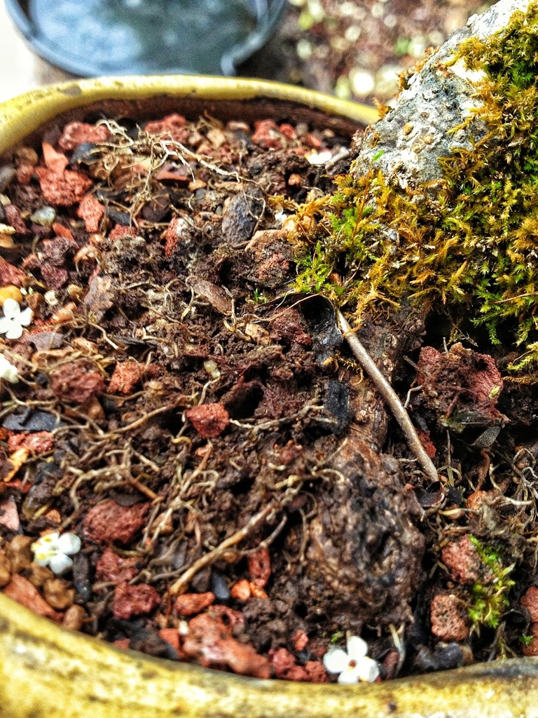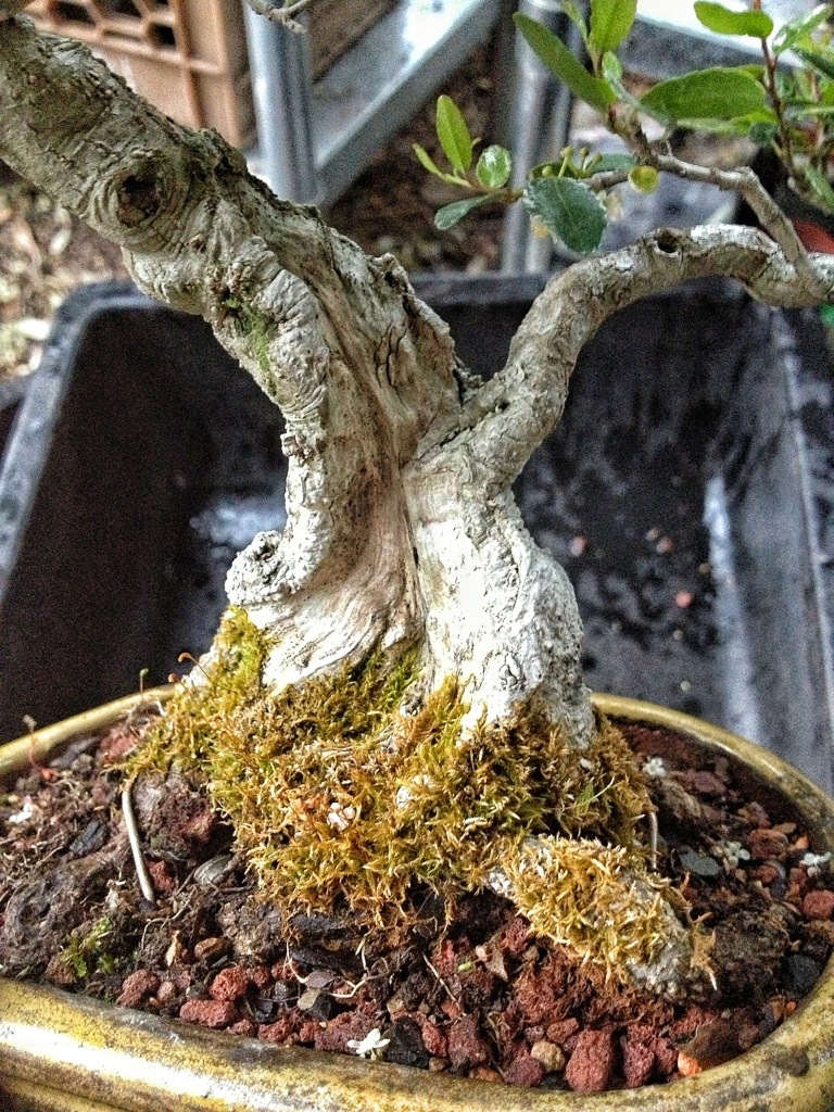 If you look close you will see the fine roots on the soil surface. This happens from keeping moss on the tree. And this is why moss is a good thing on the soil surface, especially on little trees. It allows the tree to utilize the entire soil mass where, without moss, the first 1/4-1/2 inch is wasted space.