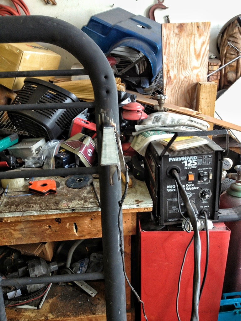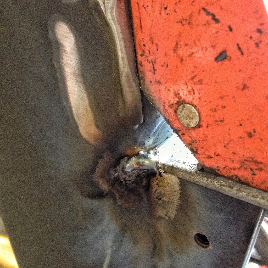 The angle iron is galvanized (Don’t weld on galvanized steel unless you are wearing breathing protection) and it’s tough to see but the welding/ heating process on the galvanization makes a snowy, cottony white substance. Don’t breath it. Not good.