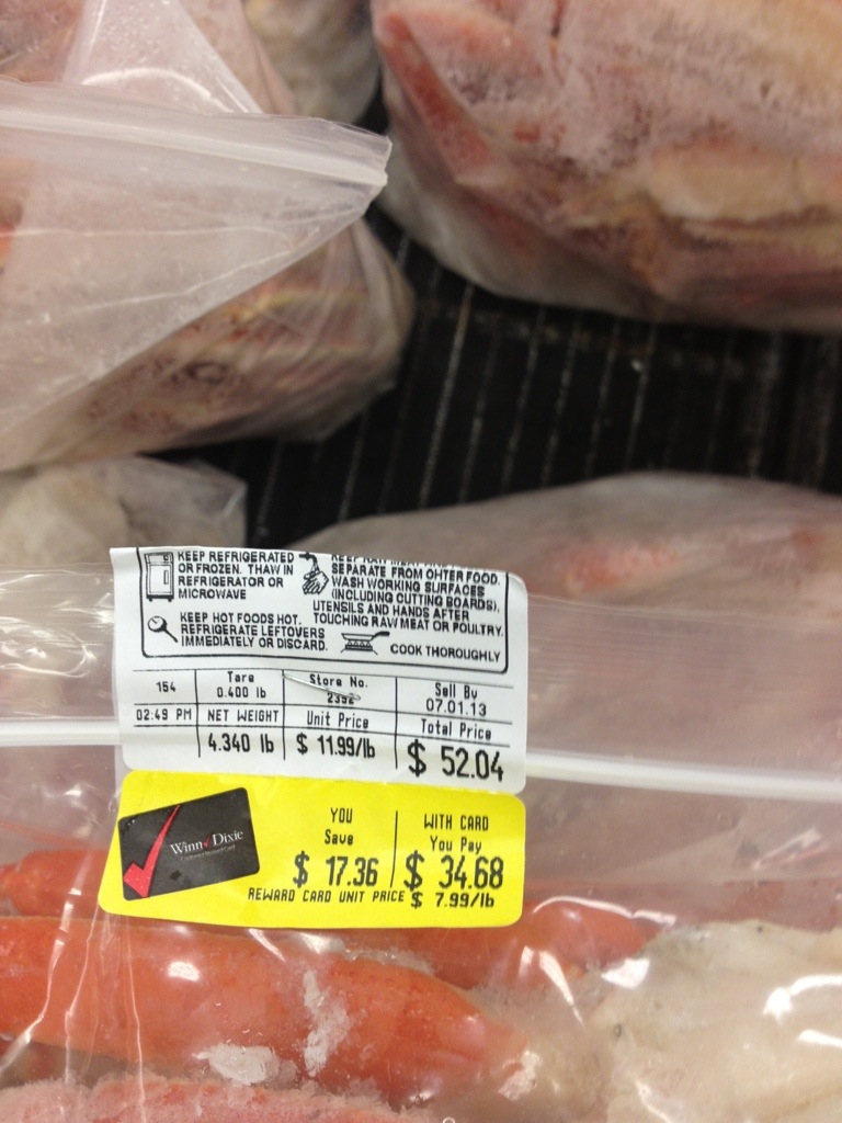 Hmmnnn….. Crab legs, $11.99 a pound…. Wait, on sale! $7.99 a pound