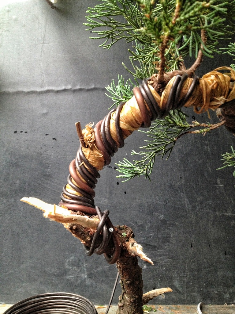The raffia also will protect the bark from the heavy wire I’m putting on it.