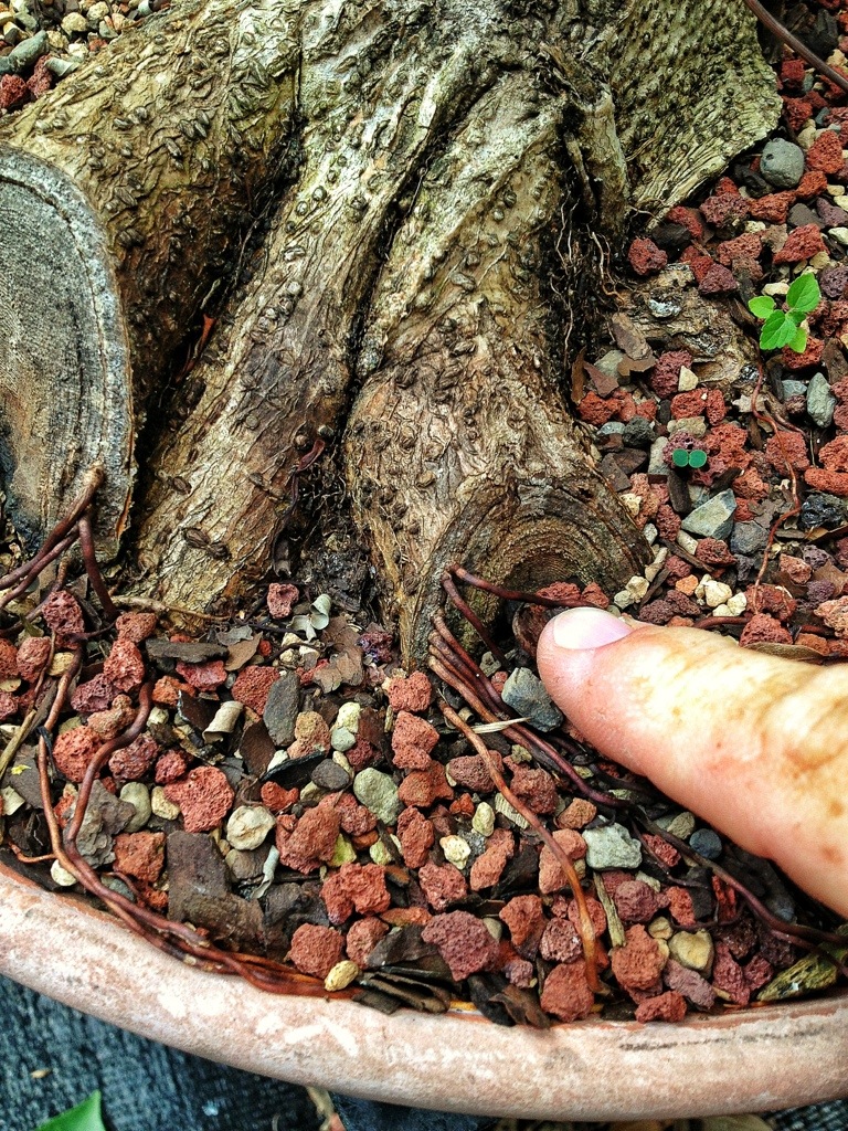 There were new shoots all up and down the trunk that I removed (which I think might become a full time job on this tree, it likes to grow) and the bevel cuts I made on the roots to taper them into the soil have all thrown roots out of those cut edges.