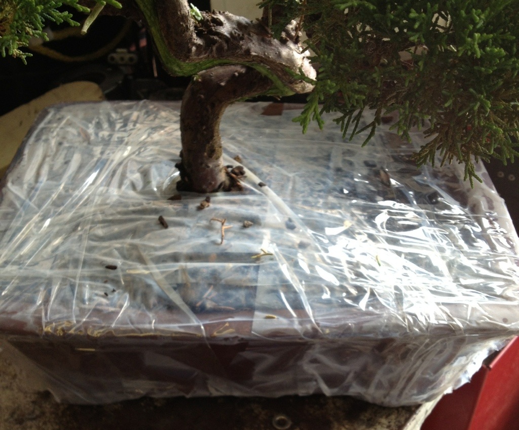 Being hot and kinda dry (even in the winter the humidity is high) I am making sure to cover the roots with a damp cloth while I am putting the tree into its new pot.