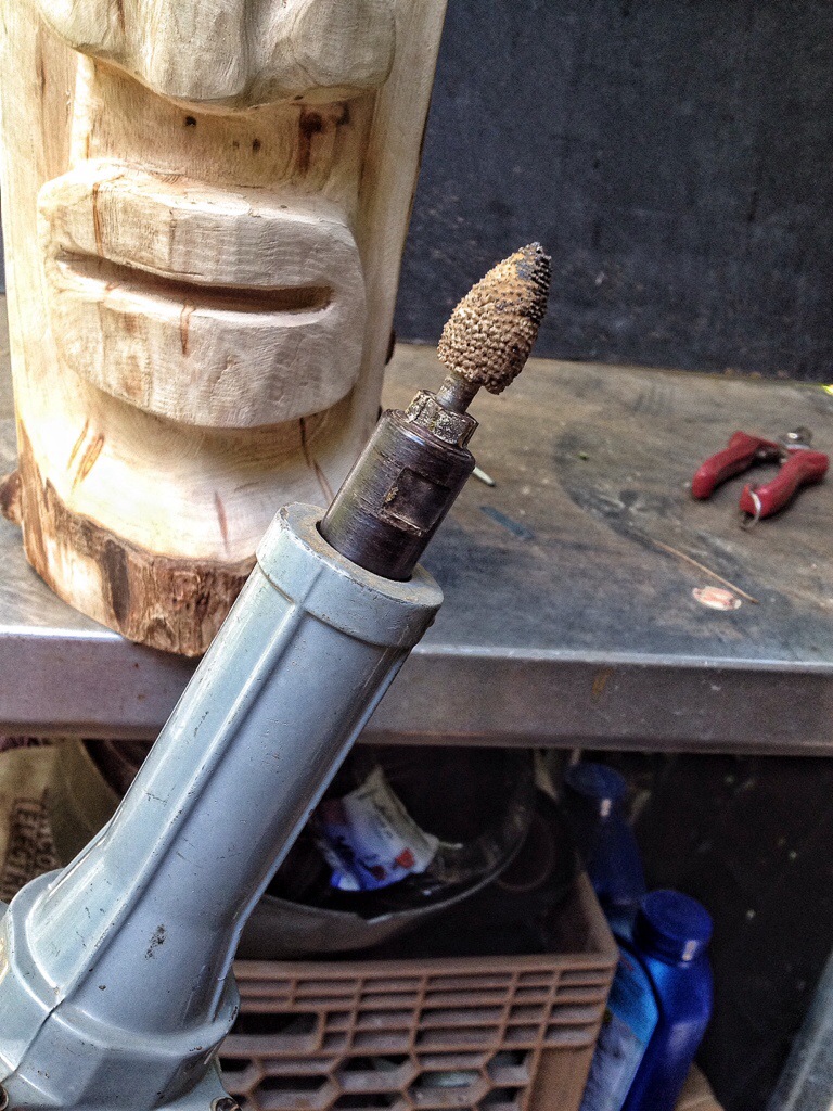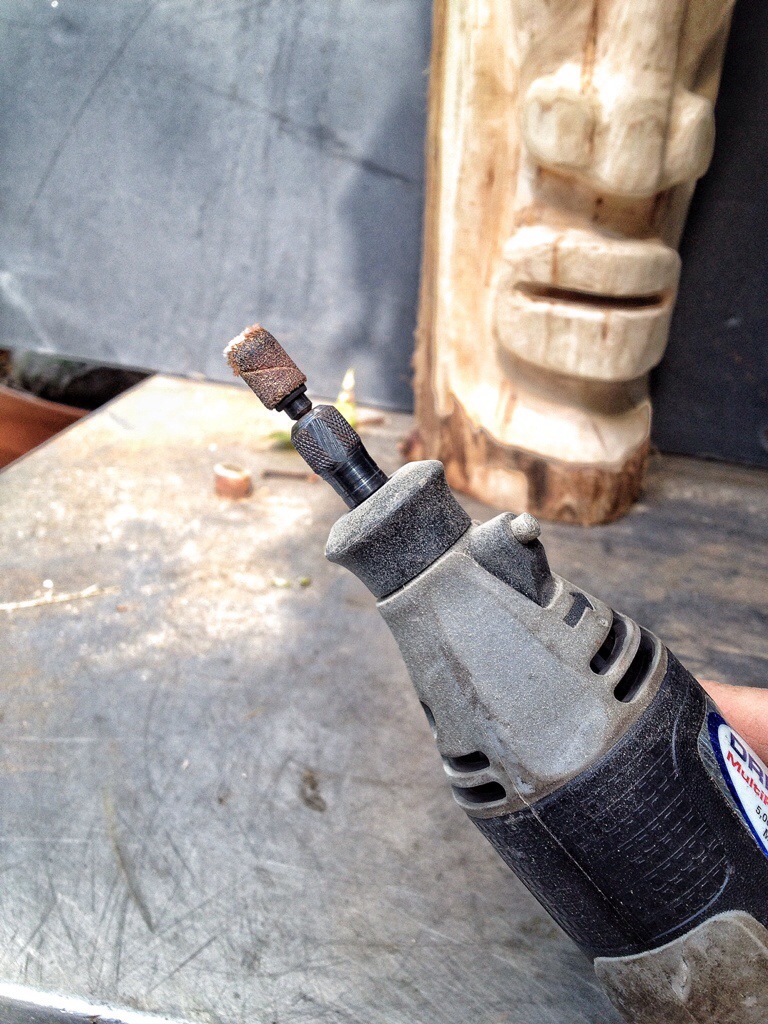 A flame tip carbide burr on the die grinder above and below, a small drum sander on the Dremel.