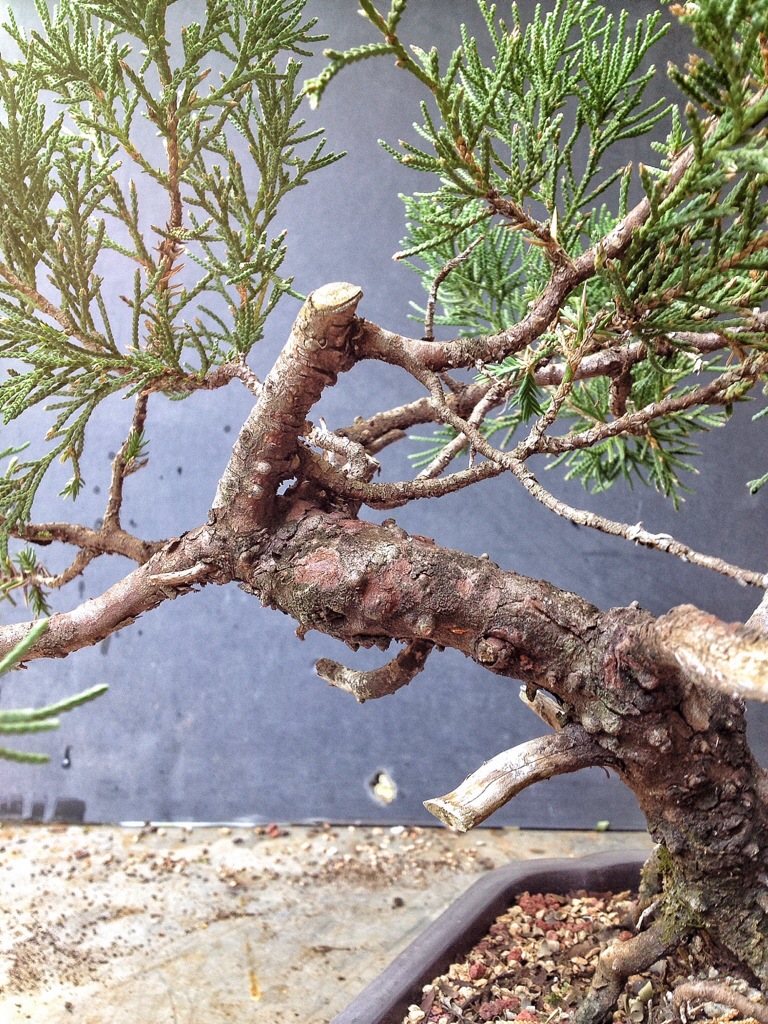 One of the aims of bonsai is to create an old looking tree out of a fairly young one. On a juniper the best way to do this is to create deadwood features (we call them “Jin” and “Shari” among others).
