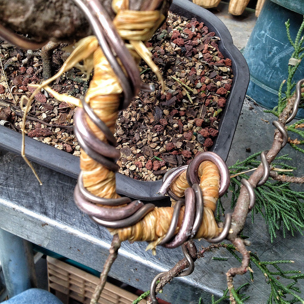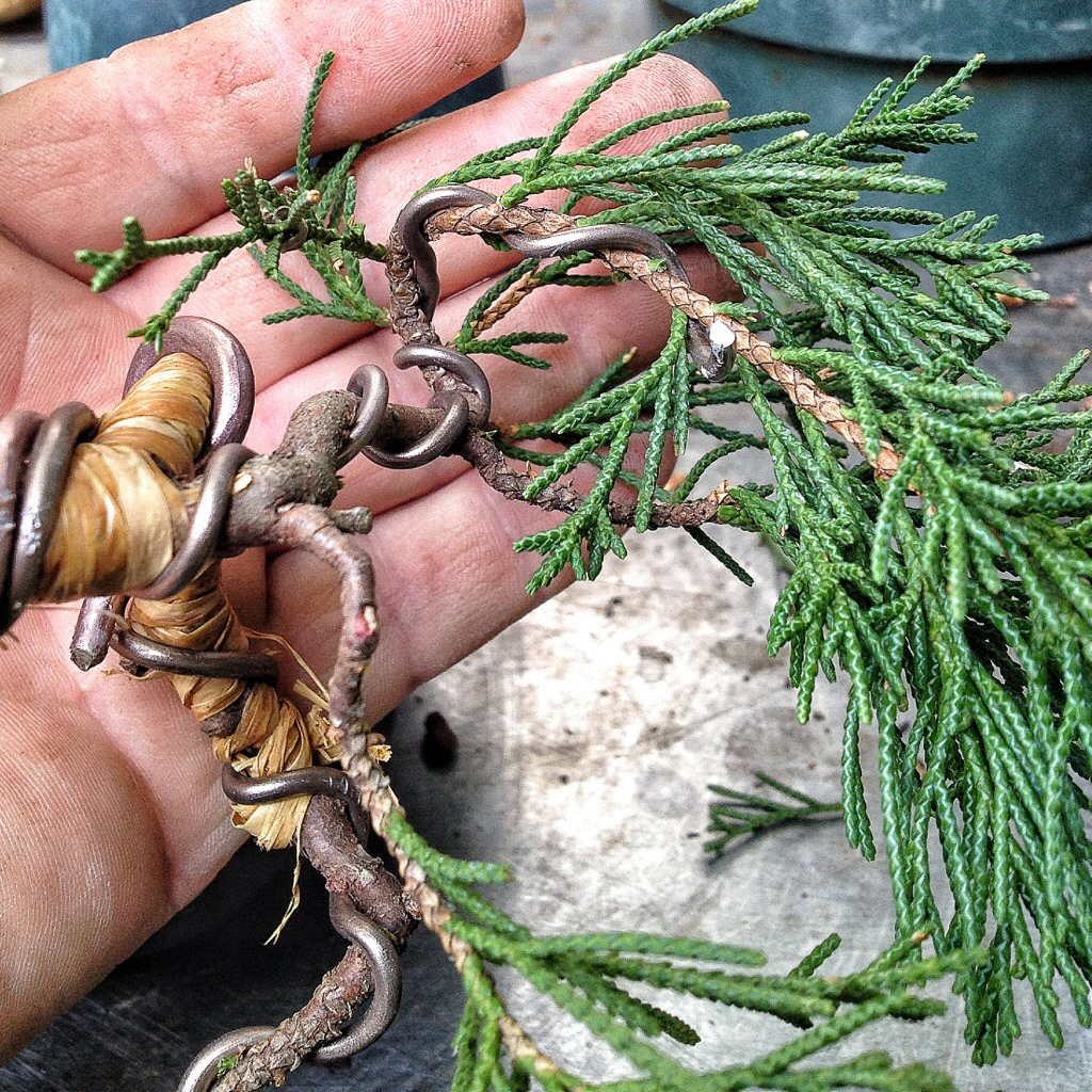Basically, I’ll wet this stuff (available at most craft stores) and wrap it tightly around the recalcitrant branches that need some help in bending.