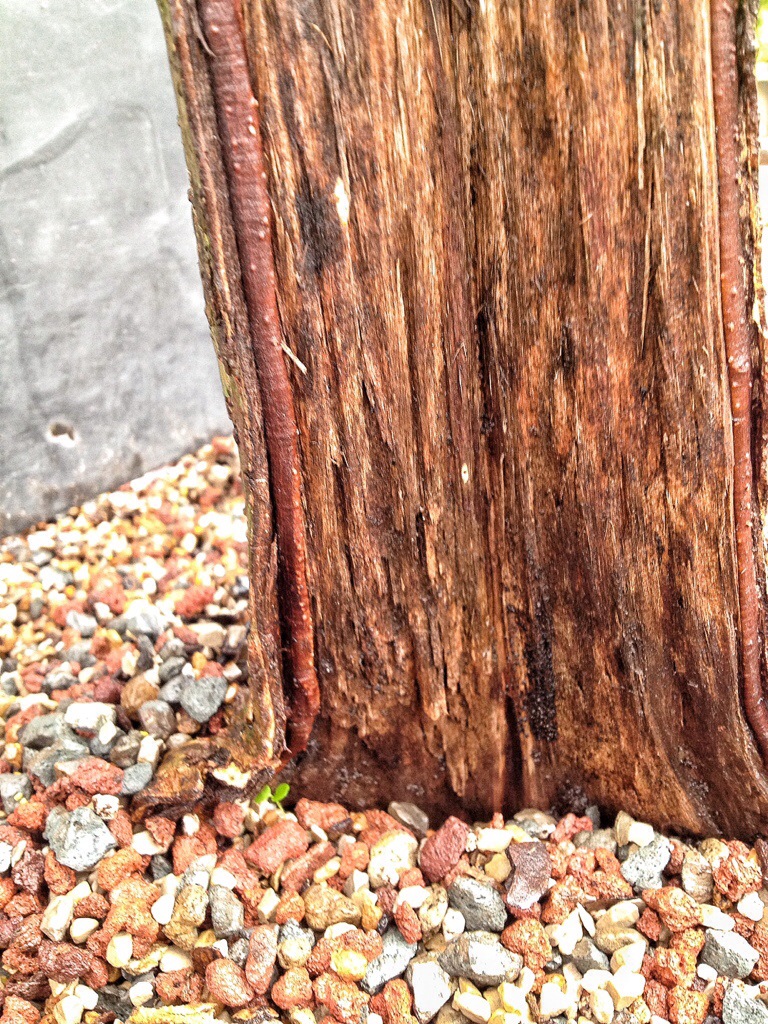 The, ah..trauma, occurred when we were rocking the tree back and forth trying to “pop” the tap root (remember, we didn’t have proper toolage) and the tree split in half from the roots up the trunk.