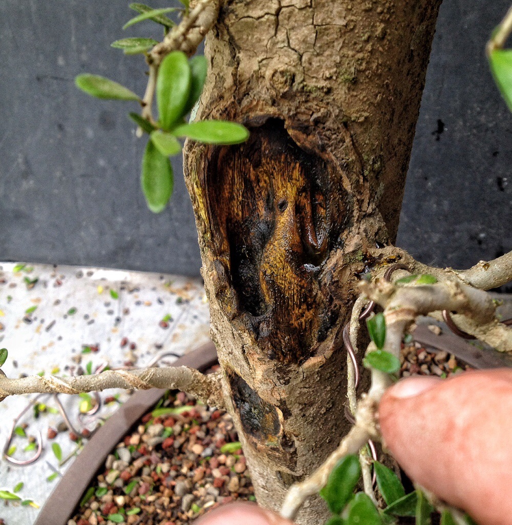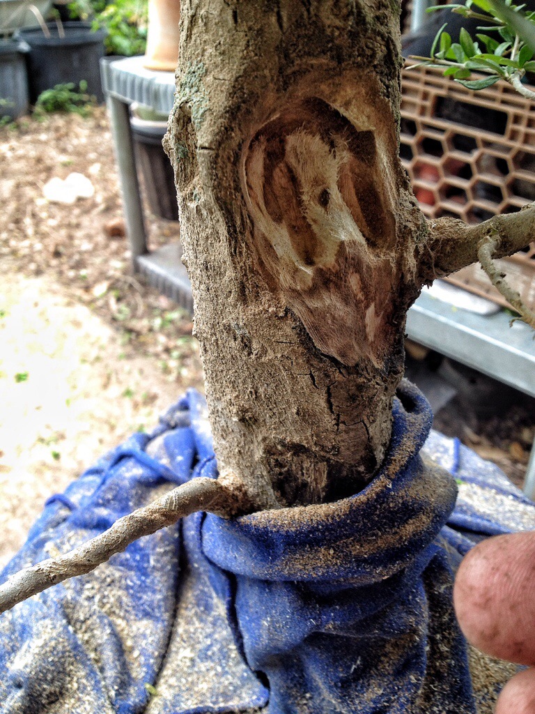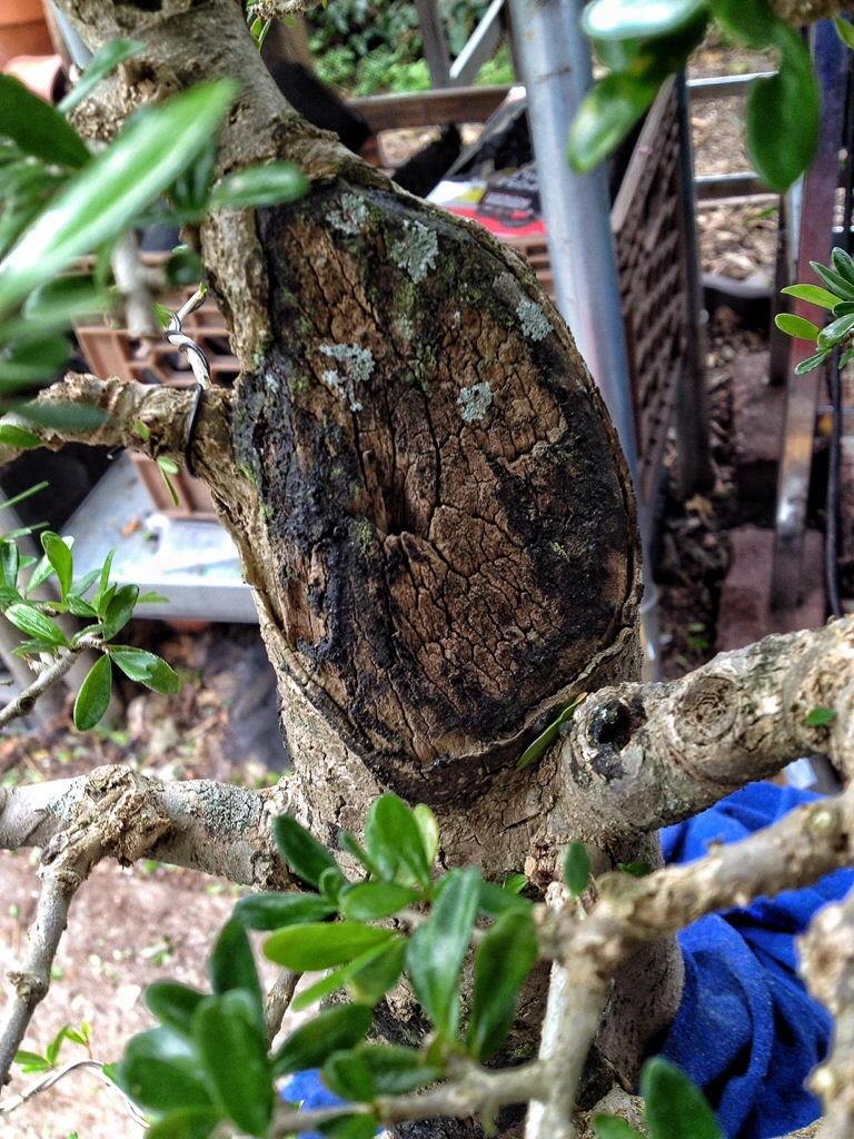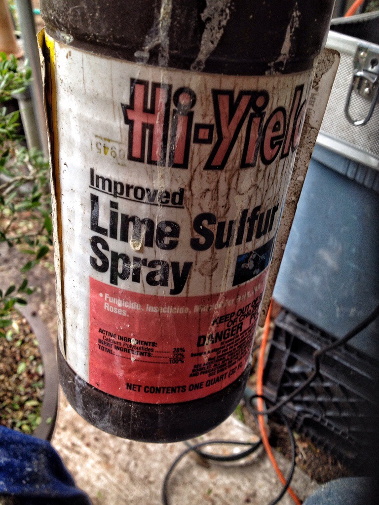 Fresh lime sulphur bleaches wood bright white and I don’t want bright white on an old looking tree.