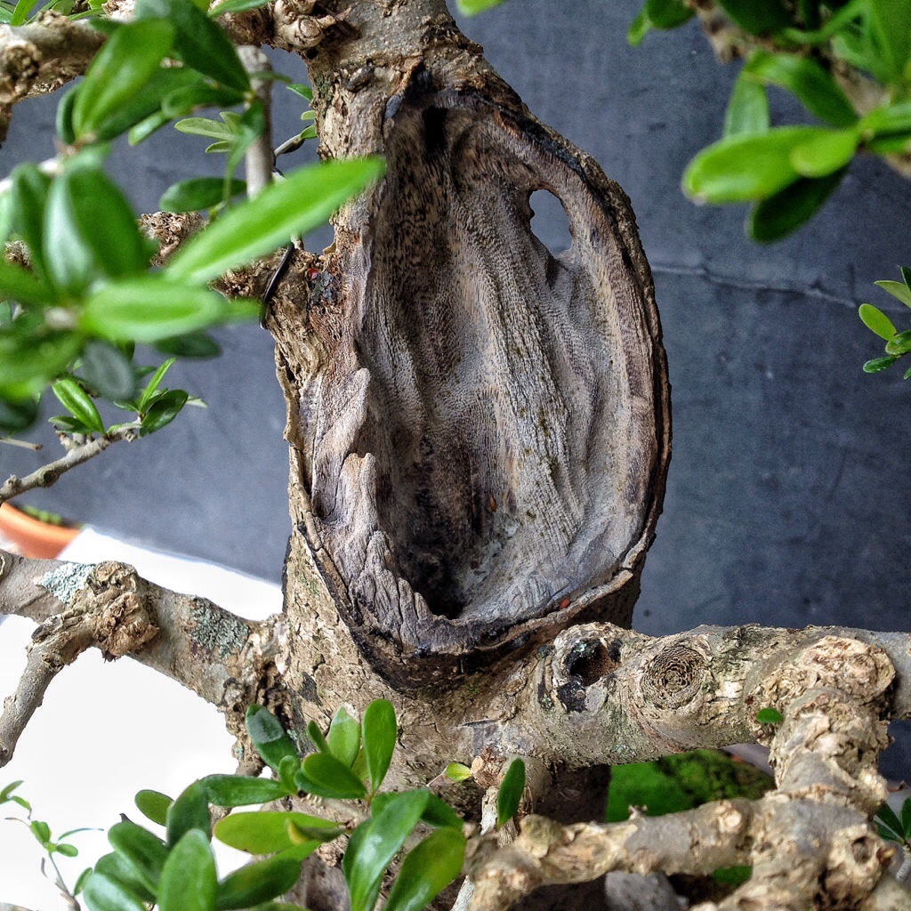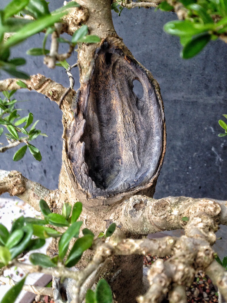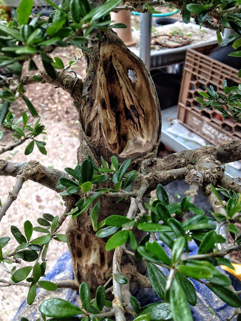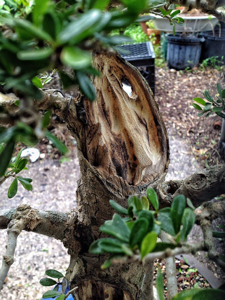 Fresh lime sulphur bleaches wood bright white and I don’t want bright white on an old looking tree.