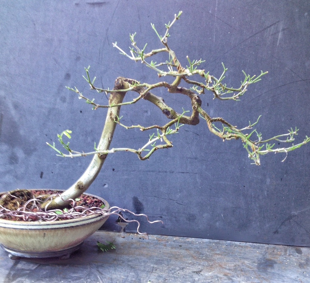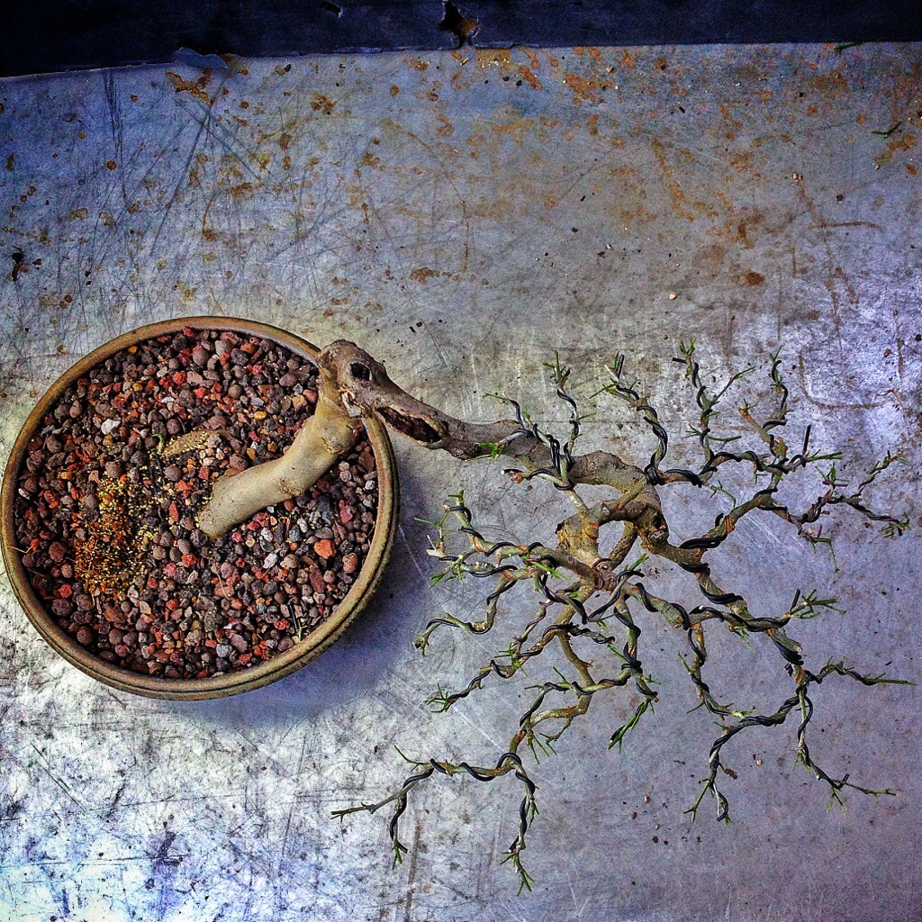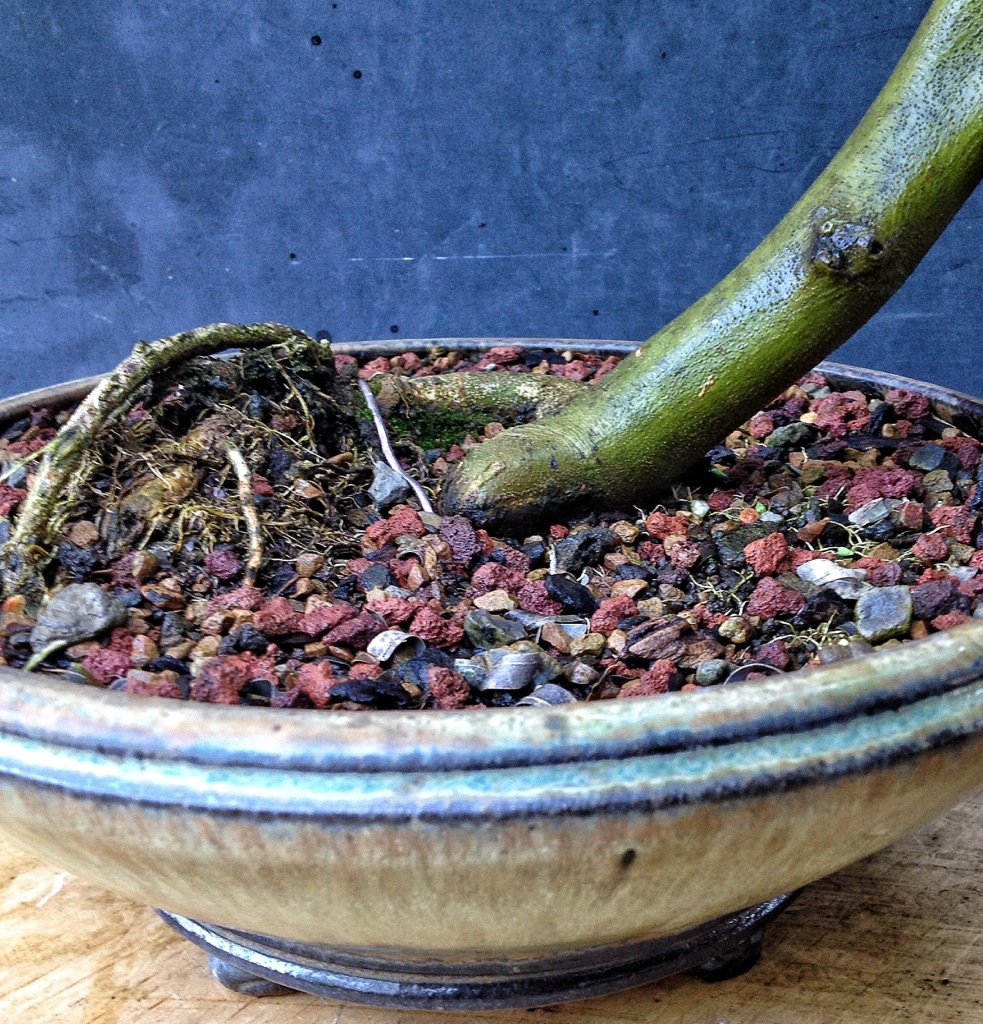 Talk about pruning roots, when I potted this tree in this pot I tilted it to add some drama.