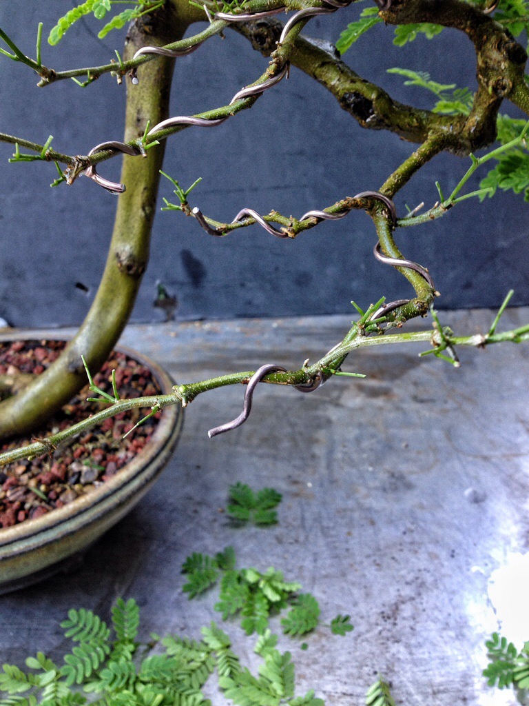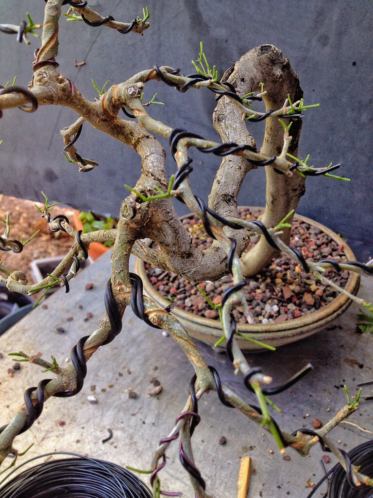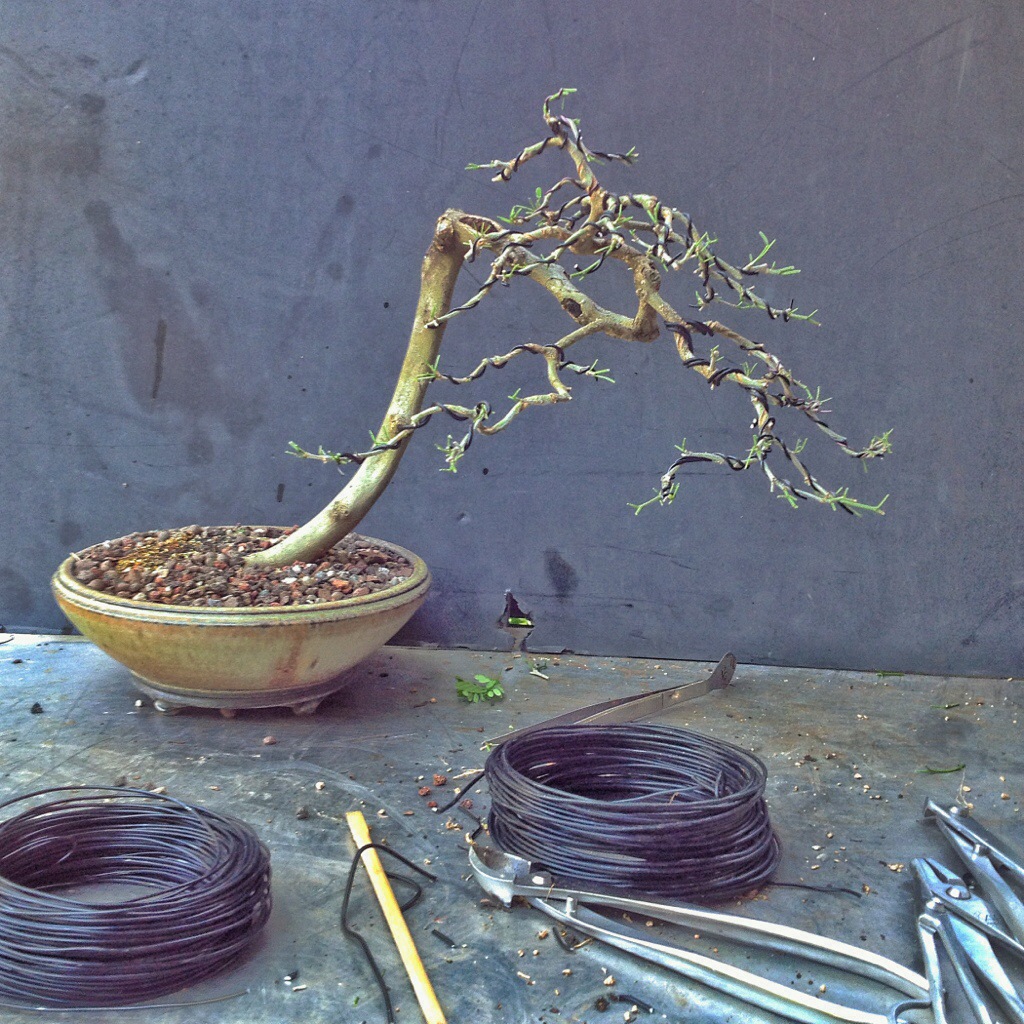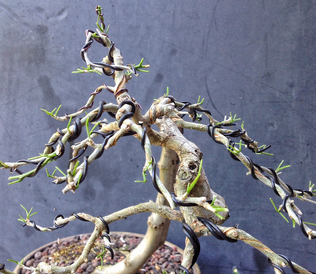 As I begin the defoliation process you’ll see the old wire and how much length I’ve gained at the branch tips.