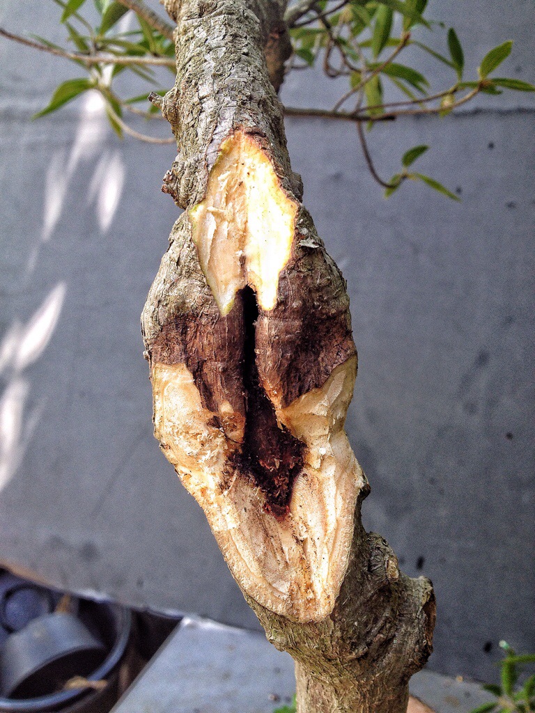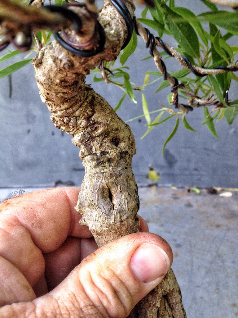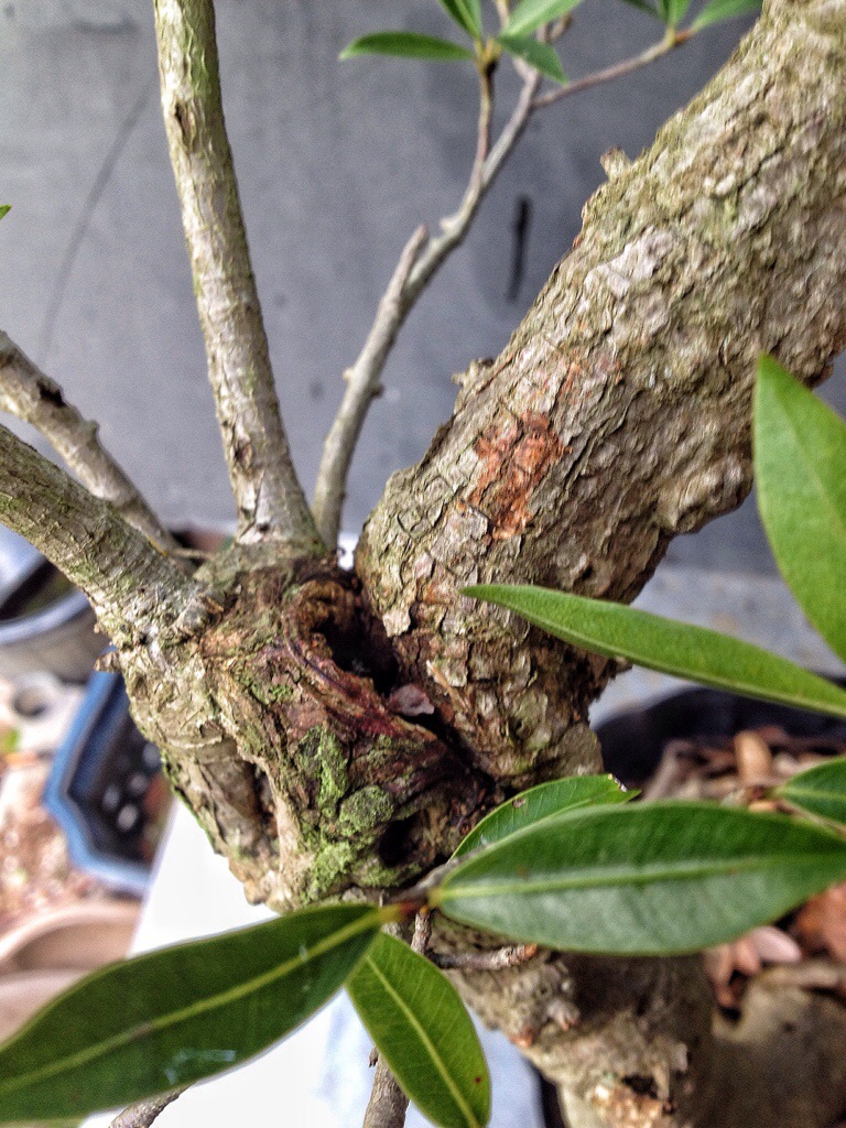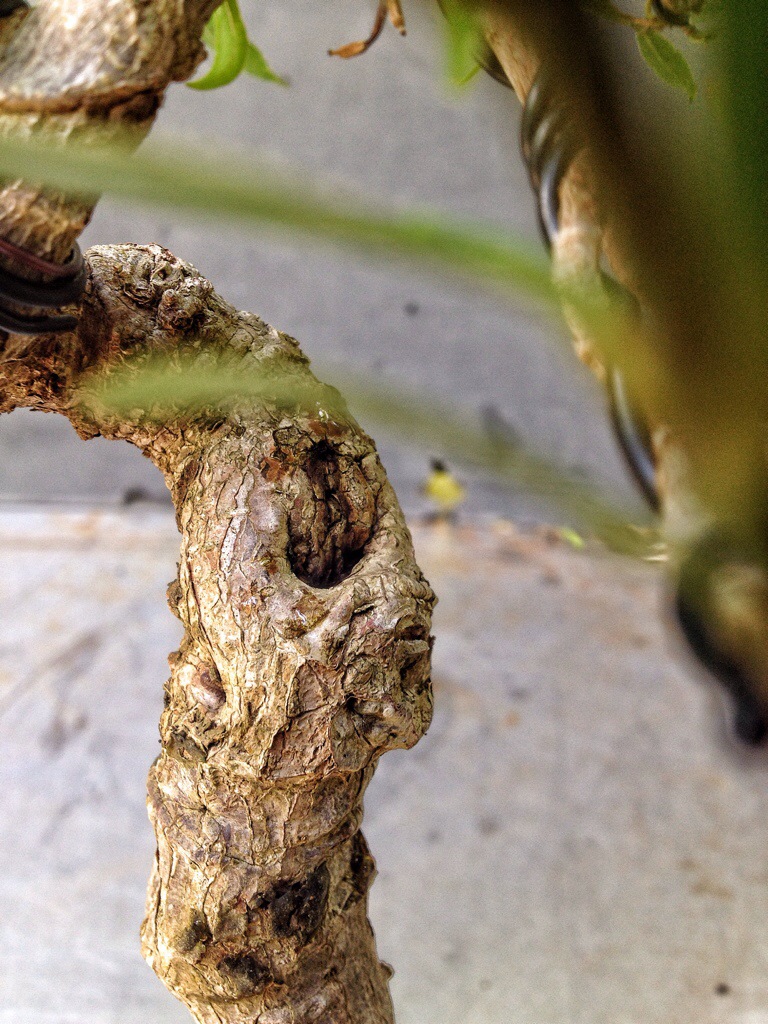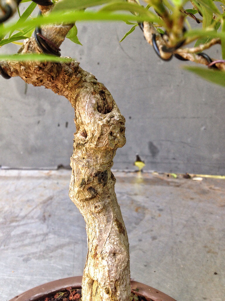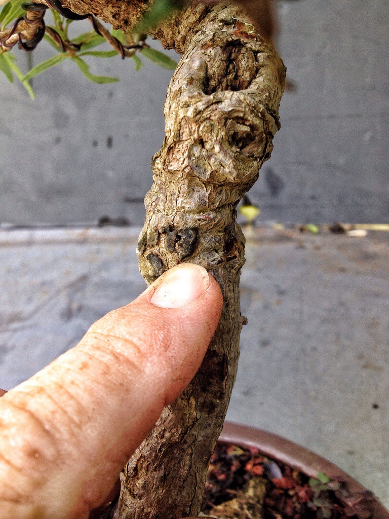 It’s well branched on top but it has an unsightly bulge where a scar of some sort has been healing.