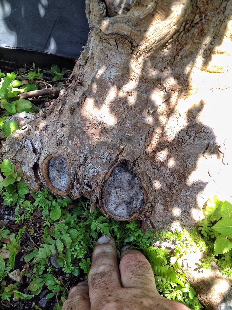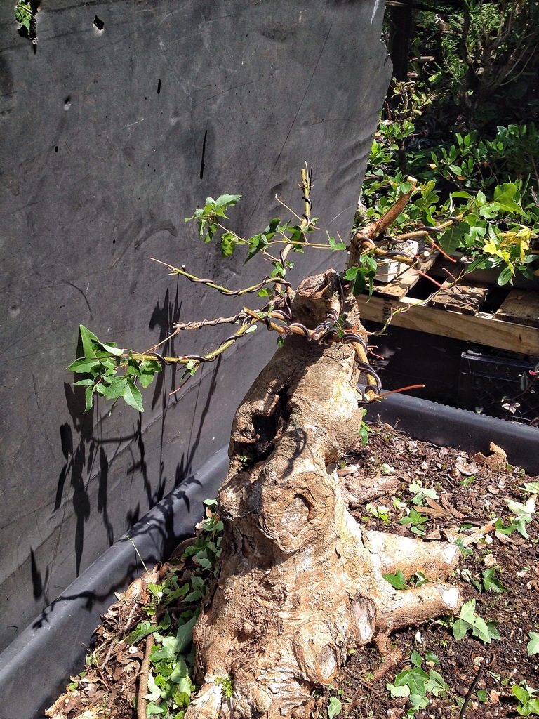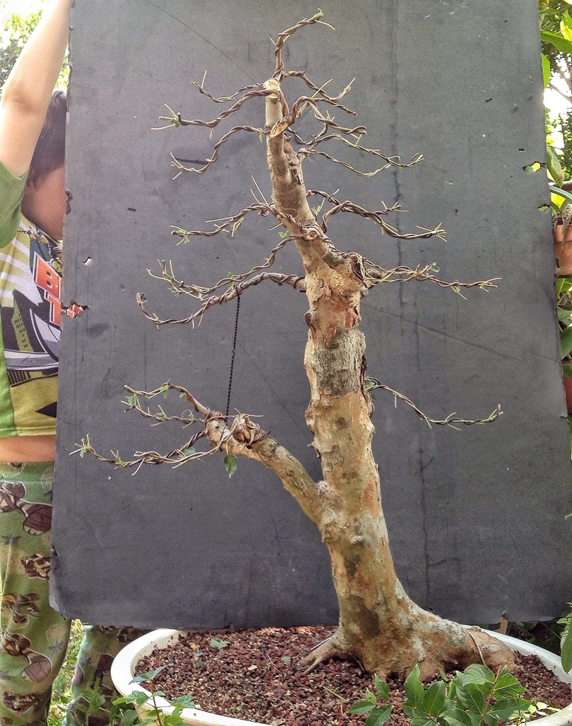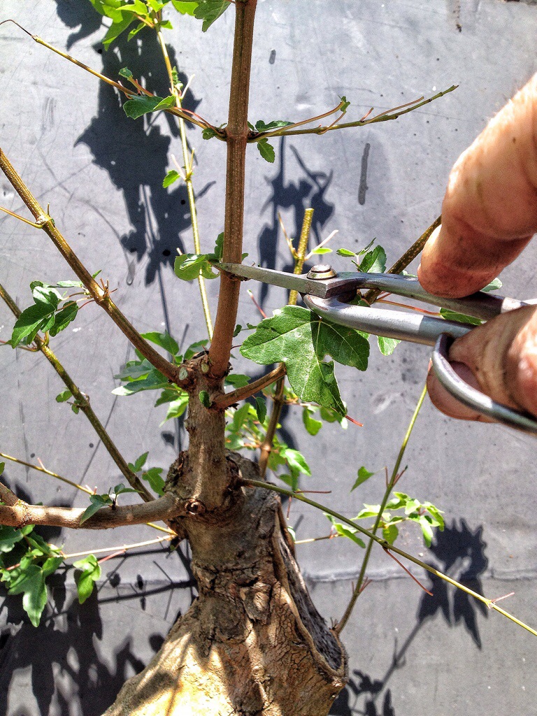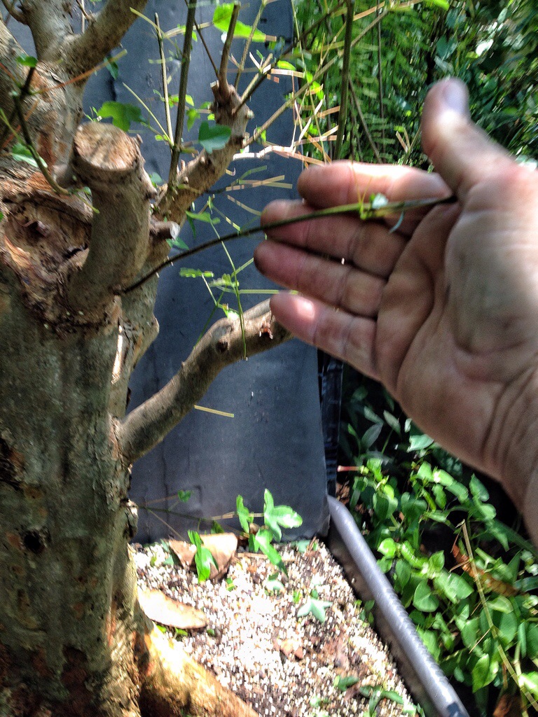 The reason I defoliated was to direct some of the energy to latent buds (which means they are there, you can see them, but because a leaf was evident further away on the trunk, it never emerged). Those latent buds are important in creating ramification (twiggyness) and even movement or taper in the branches (they might be a place I could cut back to when I’m in phase three/four).