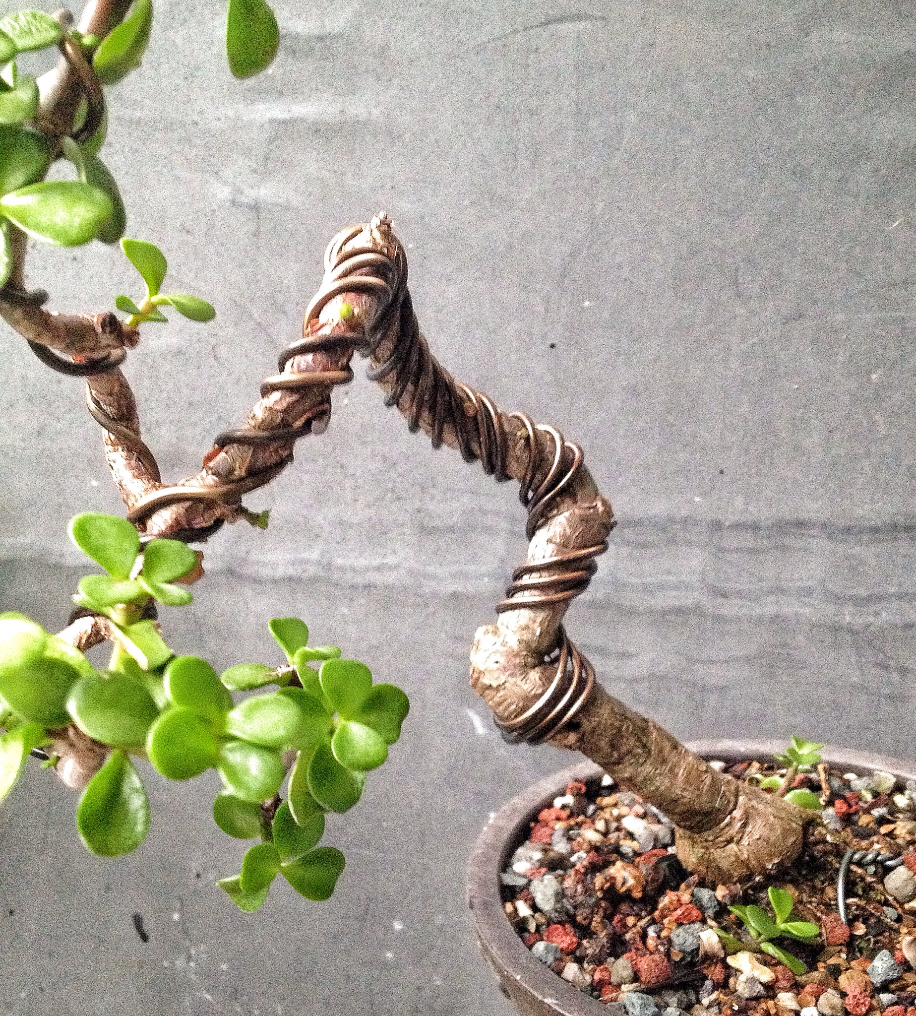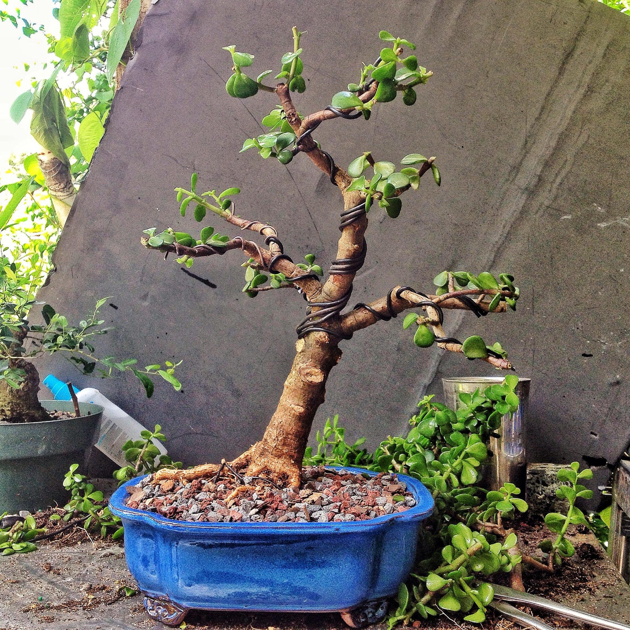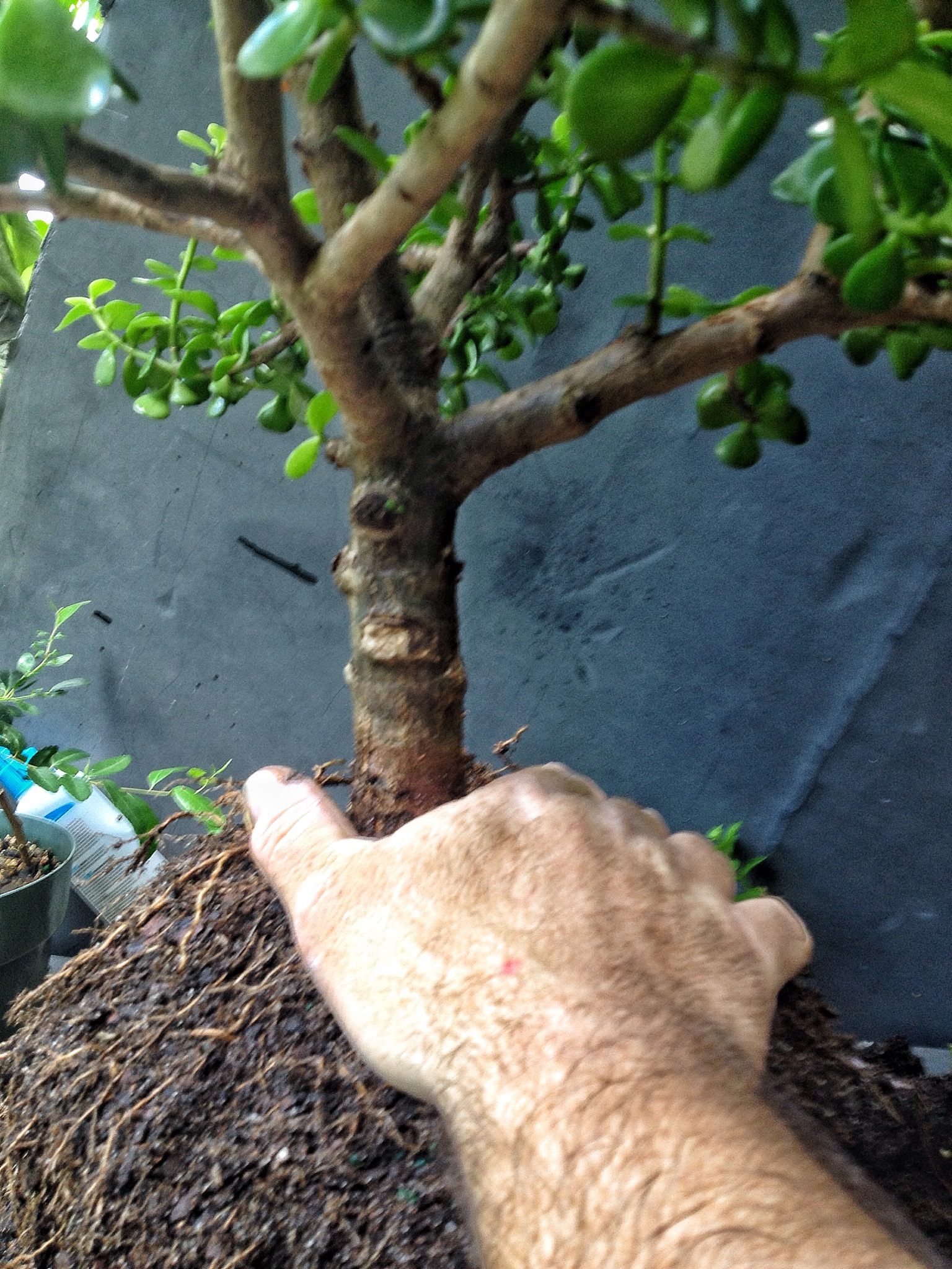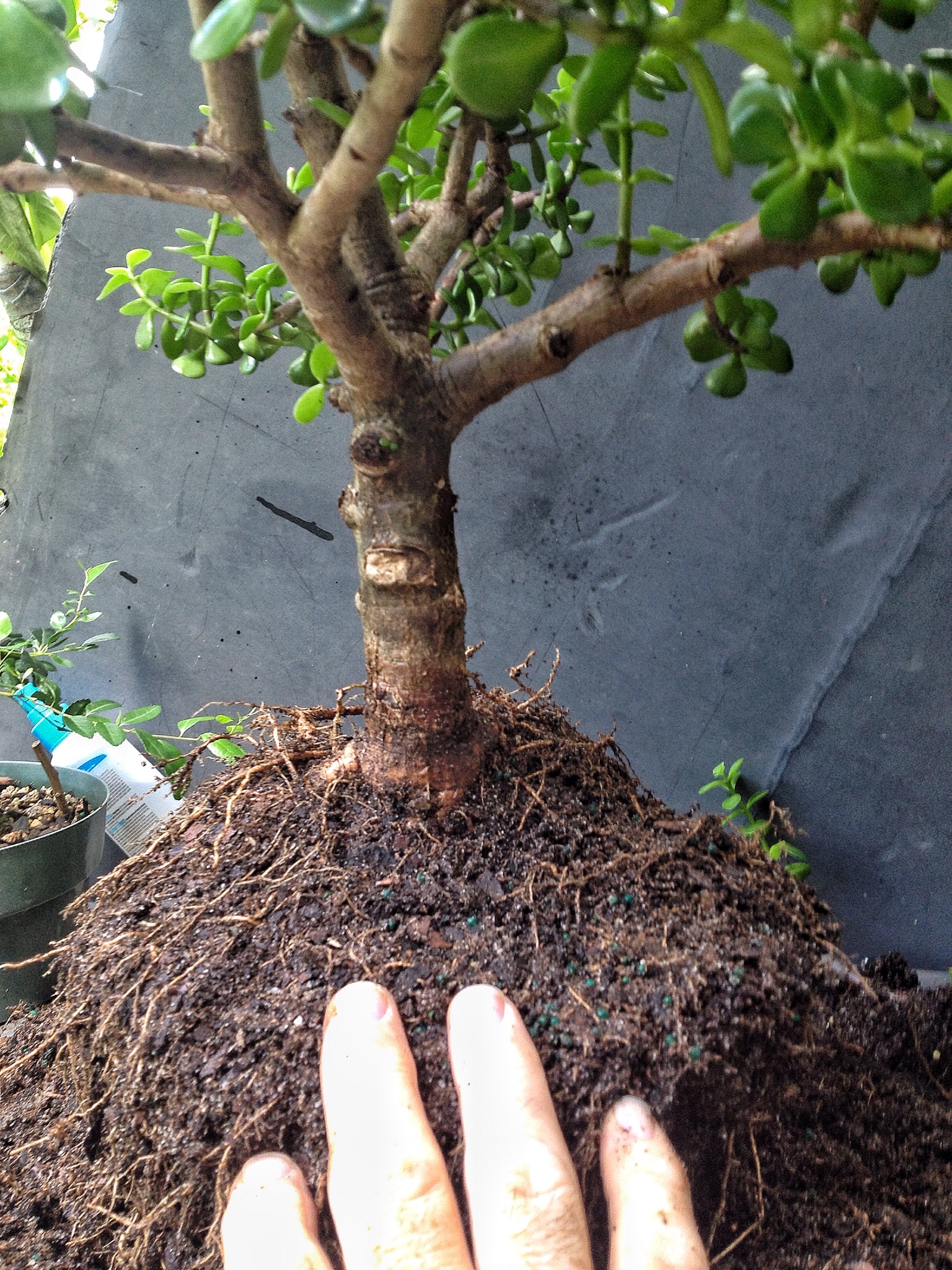 Eventually it could go in a more shallow pot but I like the deepness this pot has, which will improve drainage. After the operation when you switch from “potting soil” to “bonsai soil” is when a dwarf jade is most often going to have root rot.