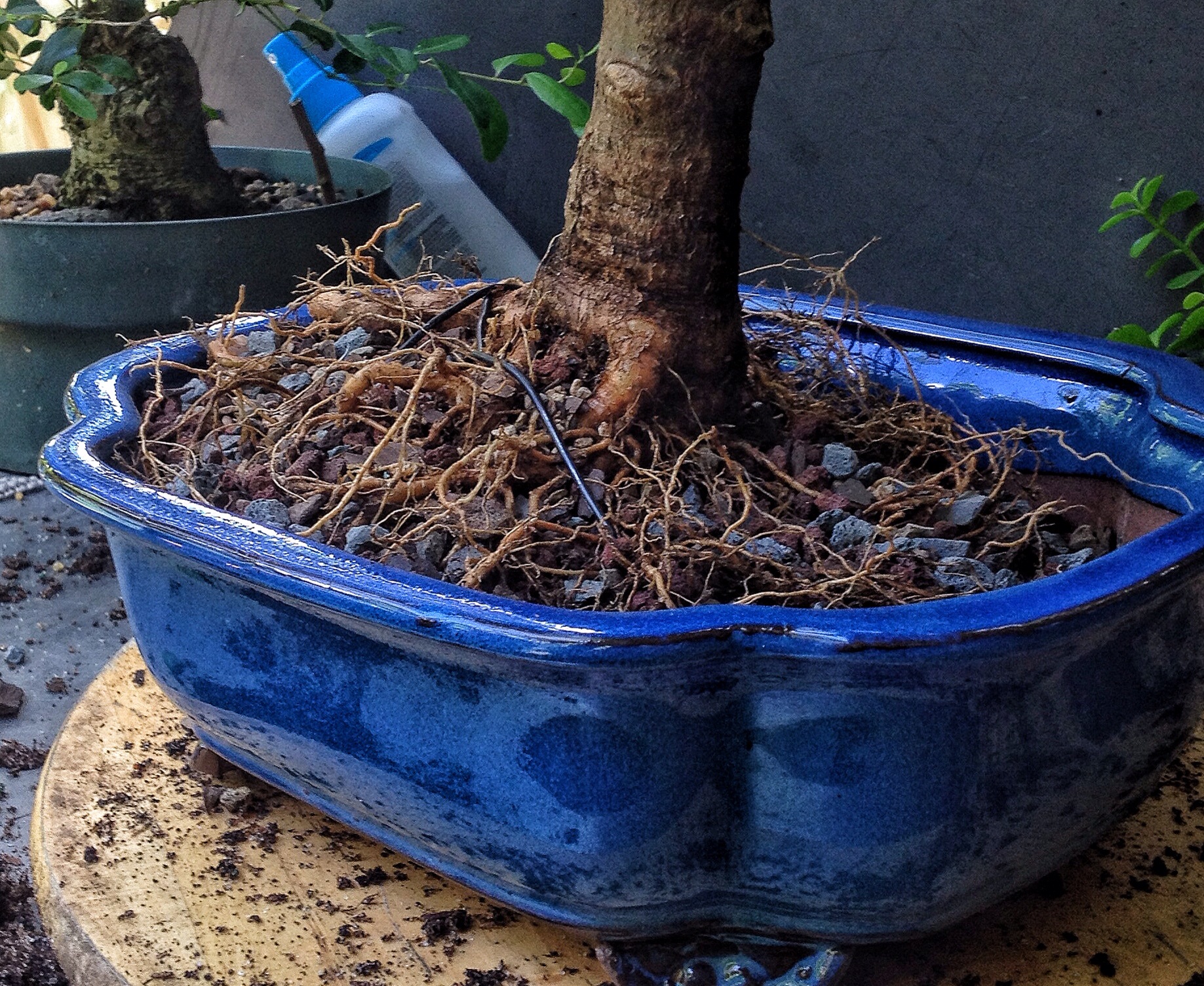 If you remember the last post on dwarf jade, you’ll know that I don’t want to water the tree for about a week after repotting. Keeping that in mind, and since I need to get as much of the old soil off the roots, I can’t use the water hose to clean it up.