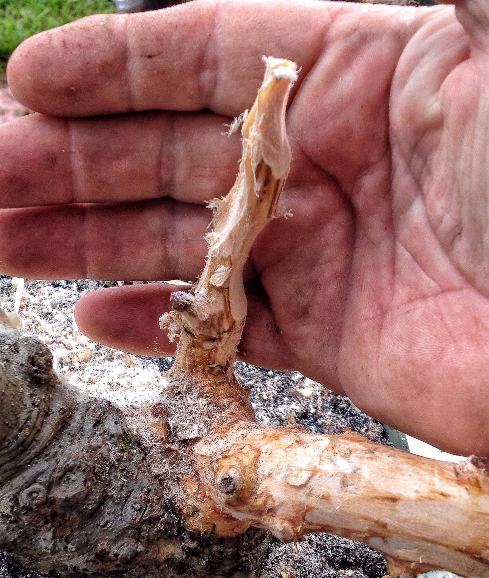 I set him to cutting back the branches and stripping off the bark of out test subject.