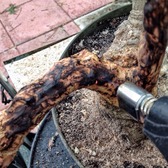 The wood on the sea grape is pretty dense, which caused some of the burning with the carving, but it was also newly stripped of bark and, therefore, very wet. Wet wood won’t hold much detail and is terribly fibrous, hence the need for the torch to burn and dry out the wood.