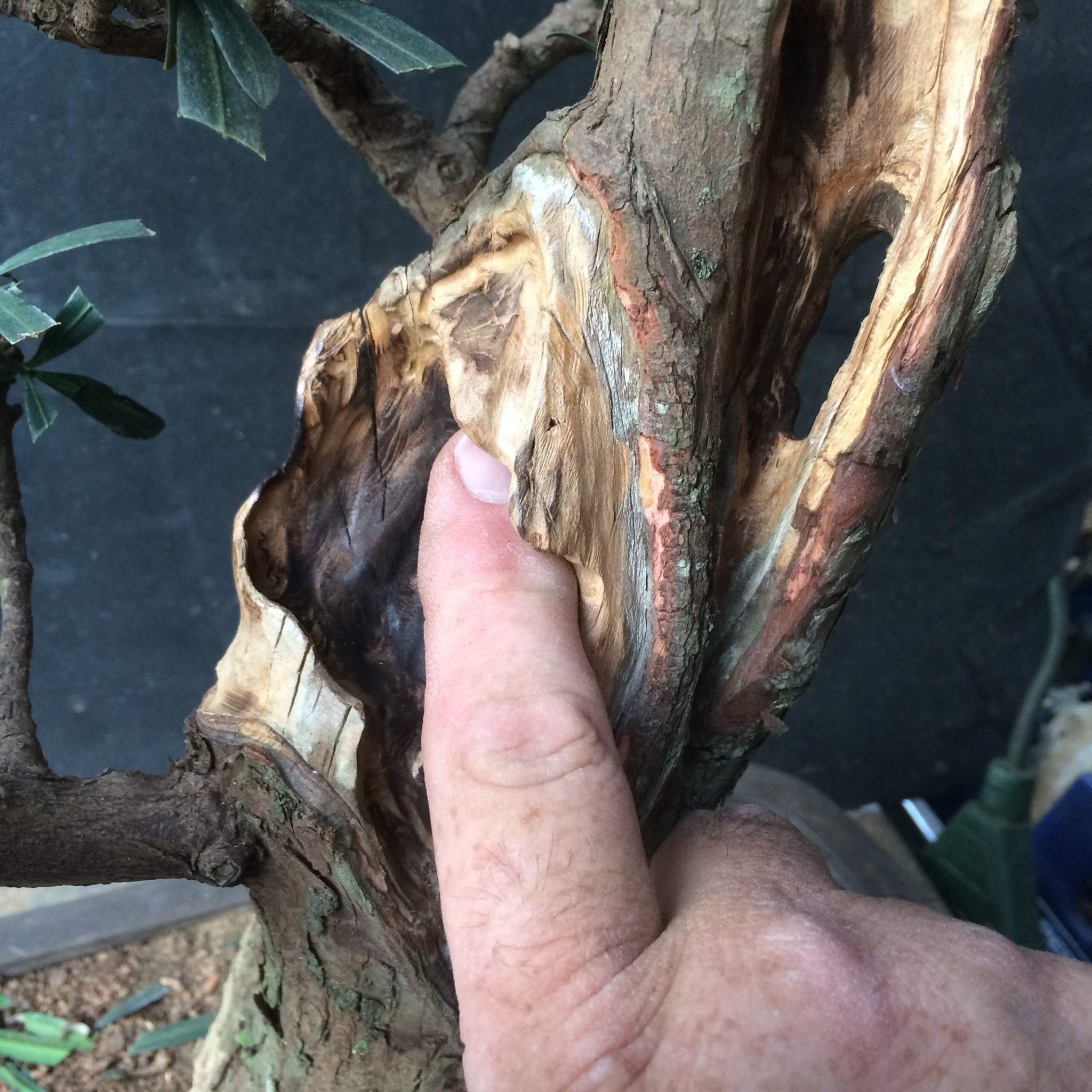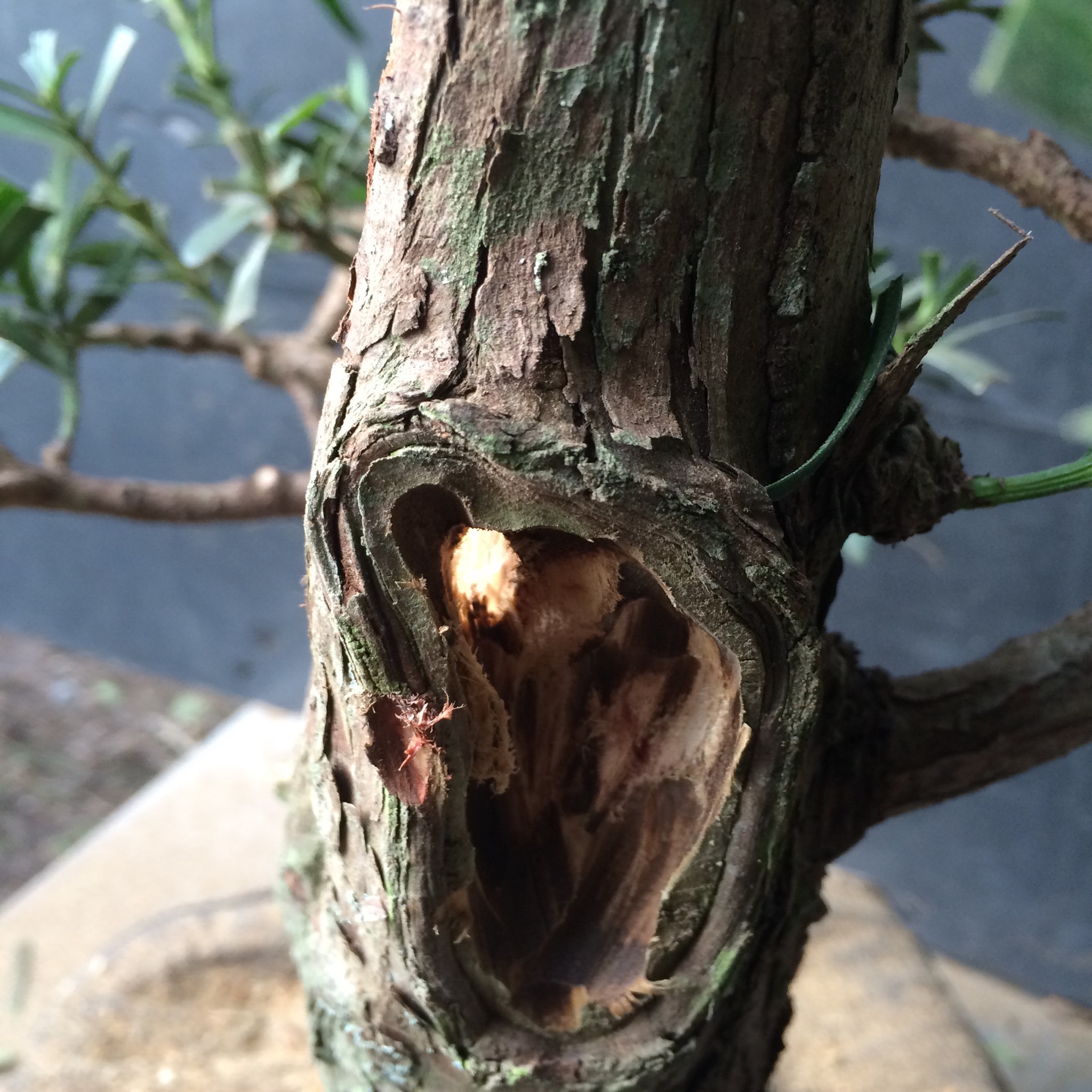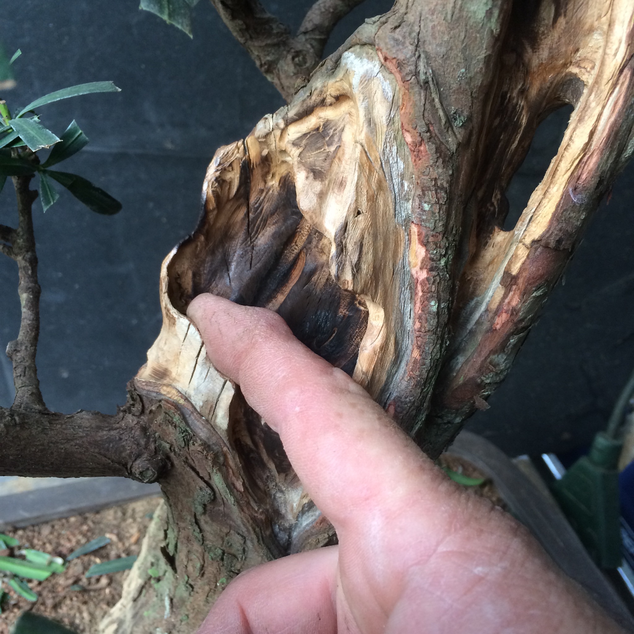 That doesn’t bother me, it is a tree, as Robert Stevens or Daniel Robertson might say, that’s in transition from maturity to decline and therefore, might exhibit characteristics like that. It isn’t a classically styled bonsai but more of a naturalistic one.