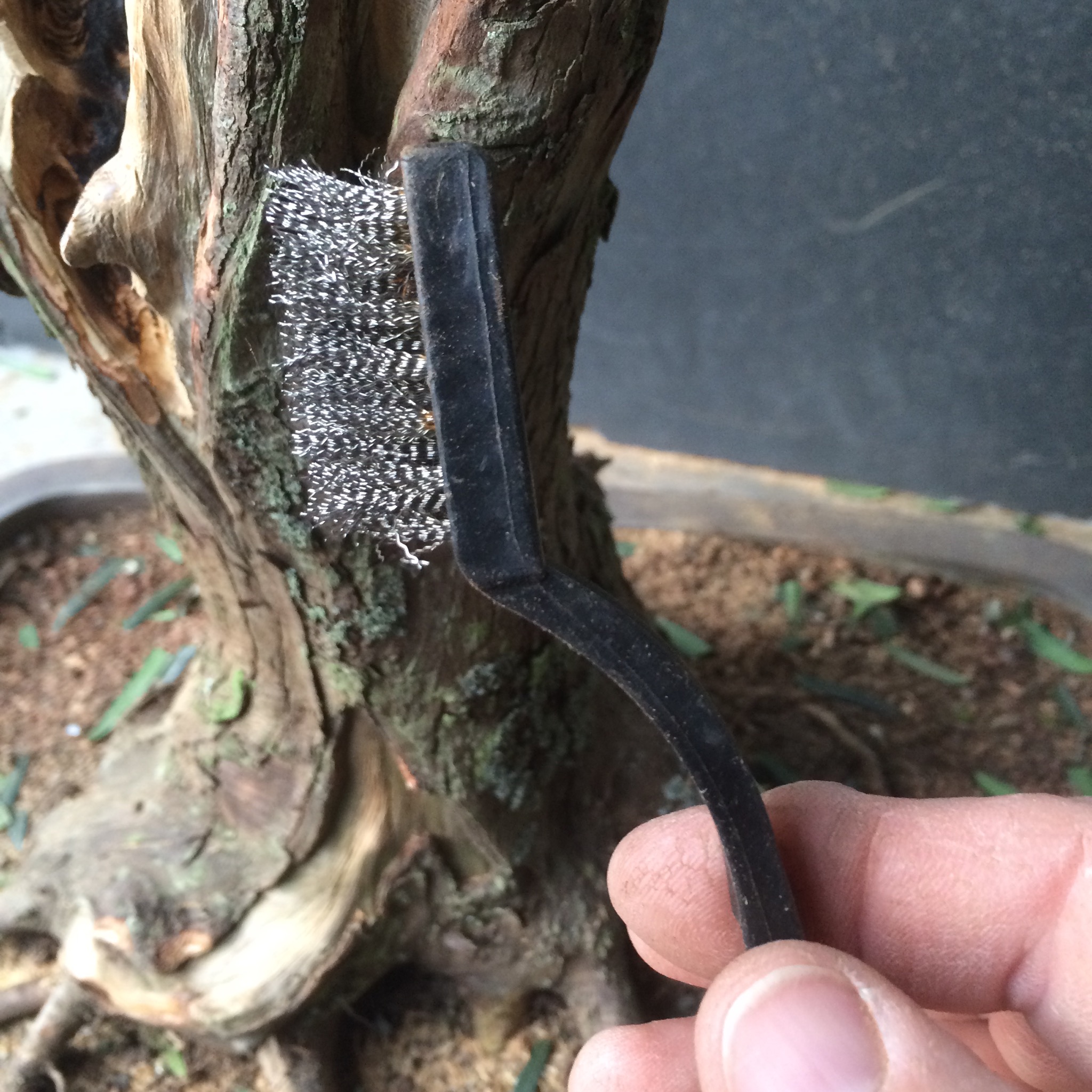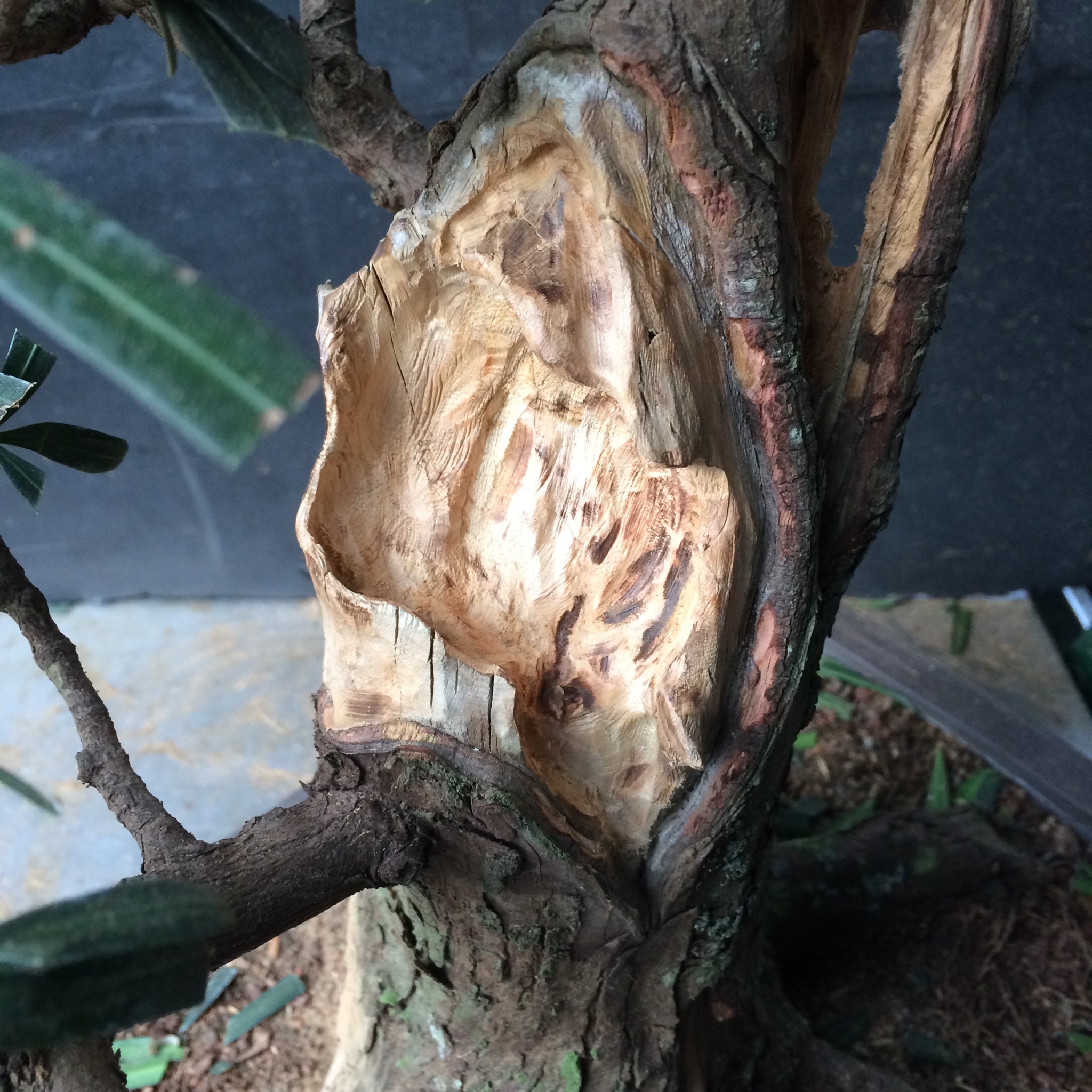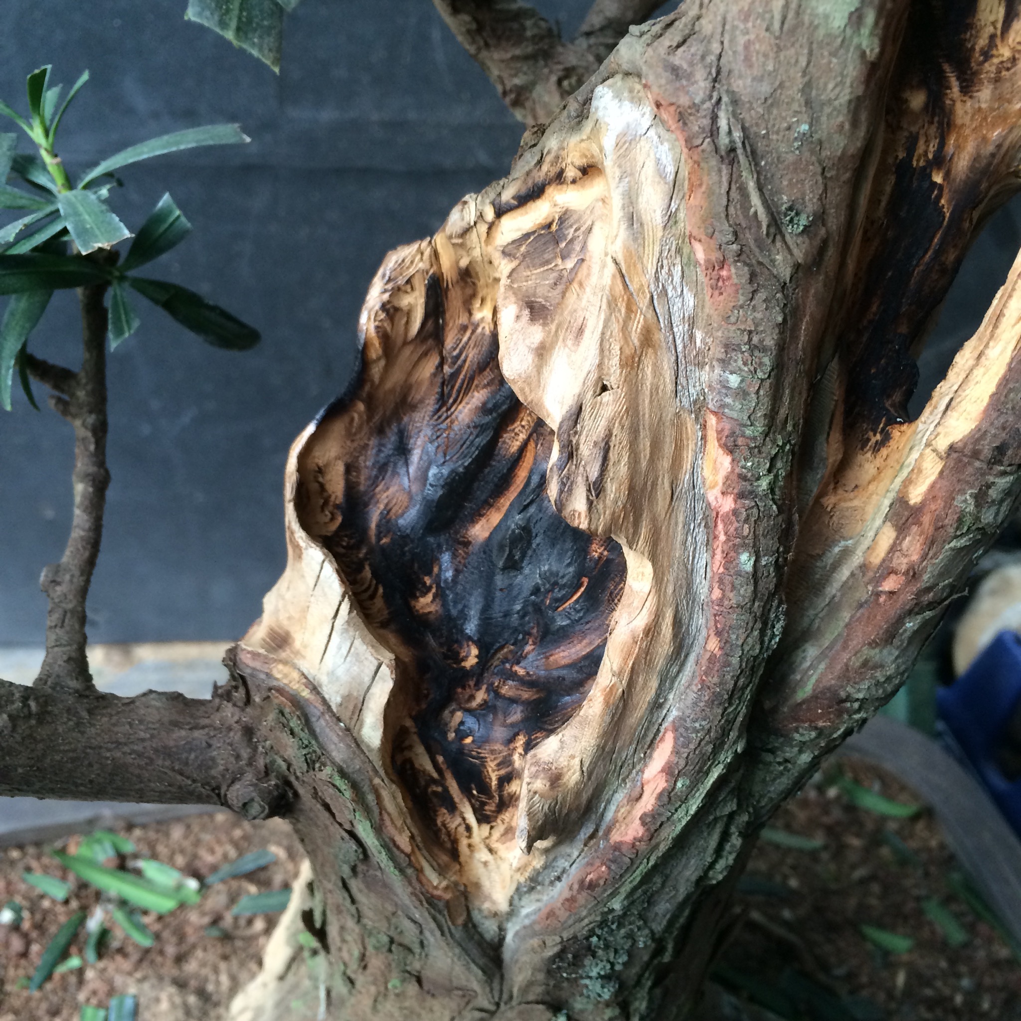 That doesn’t bother me, it is a tree, as Robert Stevens or Daniel Robertson might say, that’s in transition from maturity to decline and therefore, might exhibit characteristics like that. It isn’t a classically styled bonsai but more of a naturalistic one.