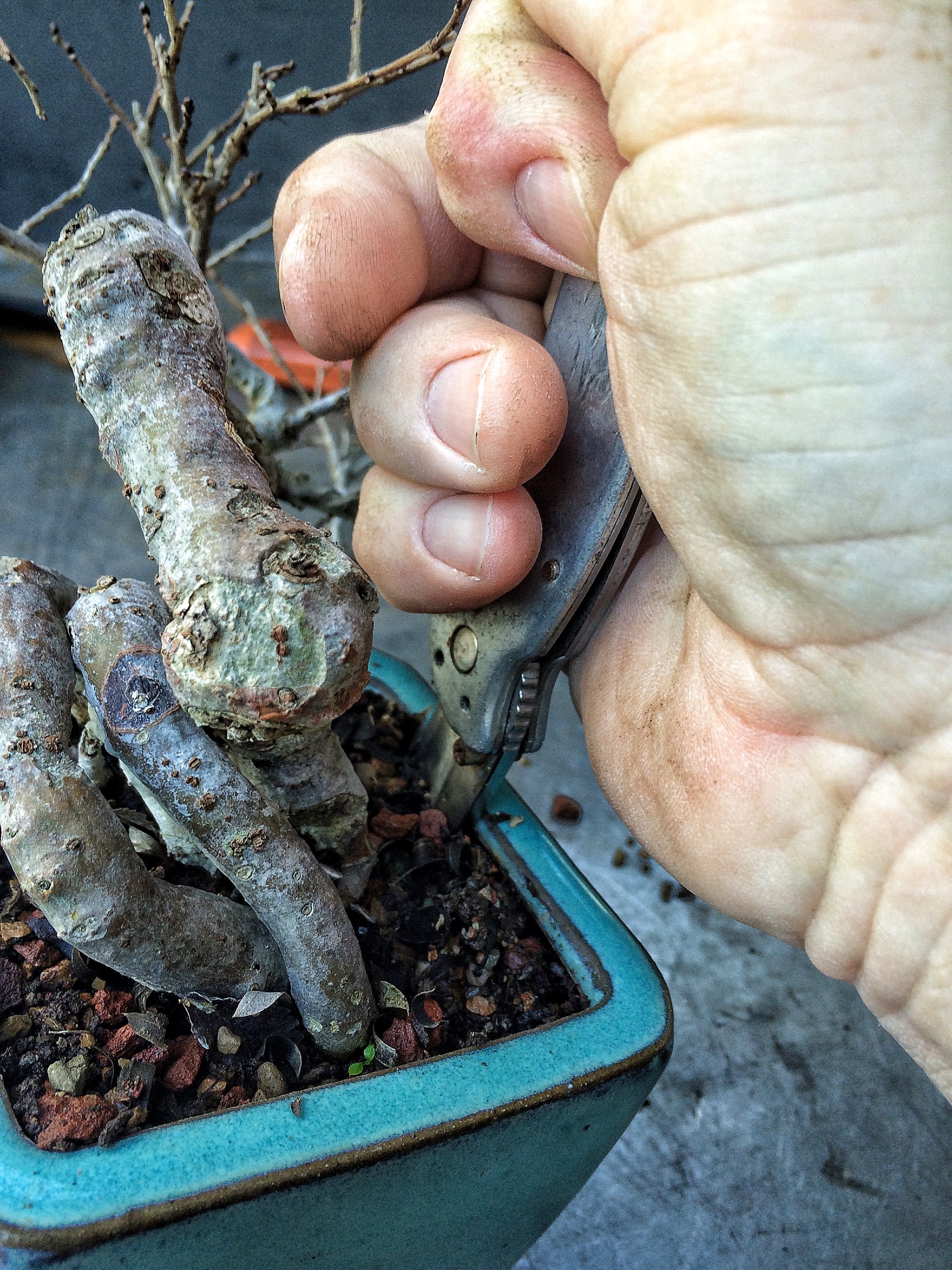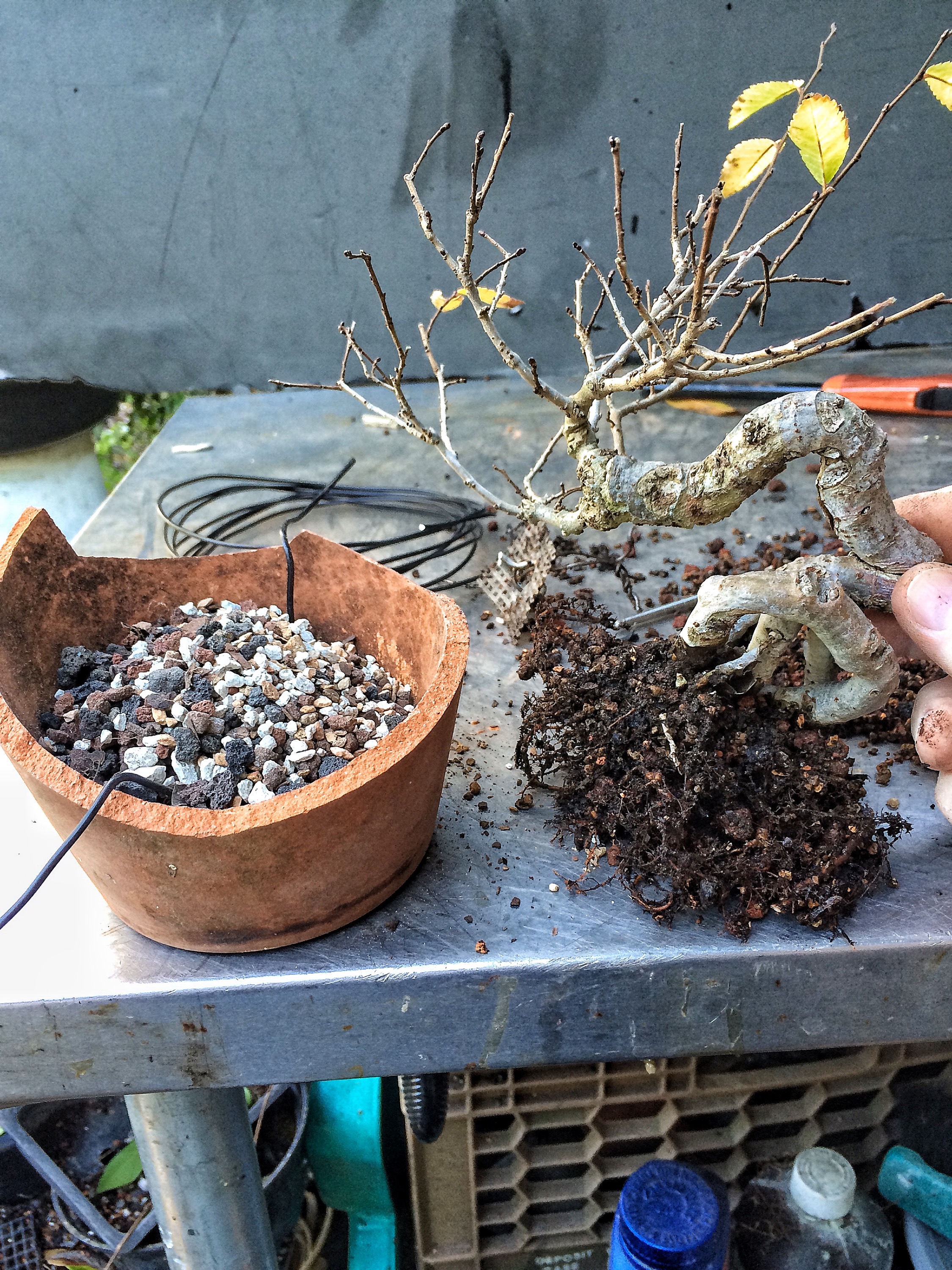 This is a root cutting, which means that, at one point, this belonged to a larger tree but was cut off to fit that larger tree into a smaller bonsai pot. Elm’s roots will regrow from the chopped off point. I do have several posts on the subject if you’re really interested.