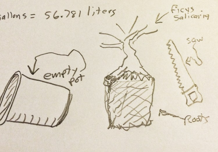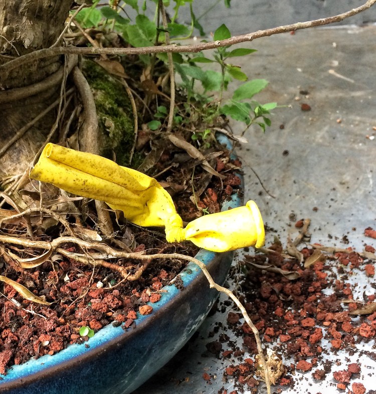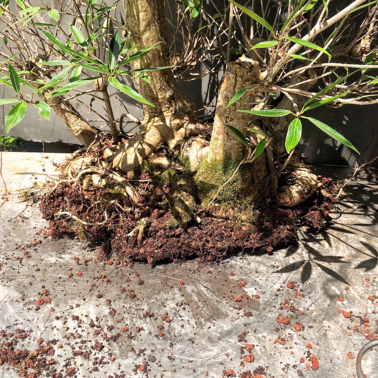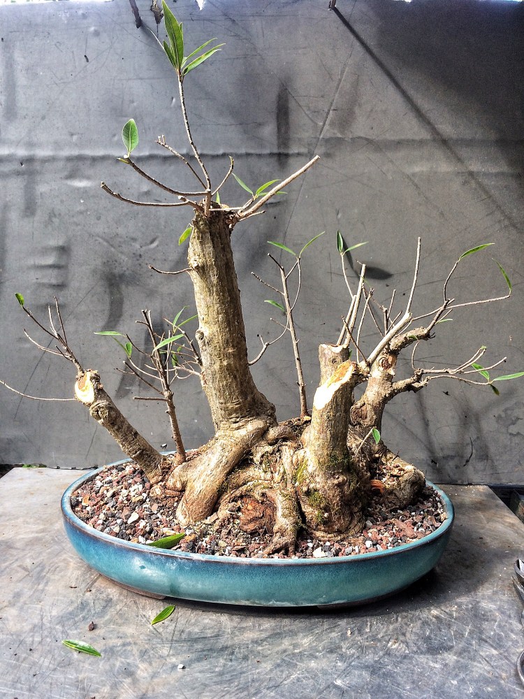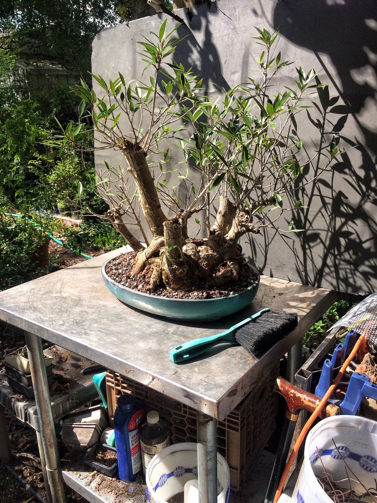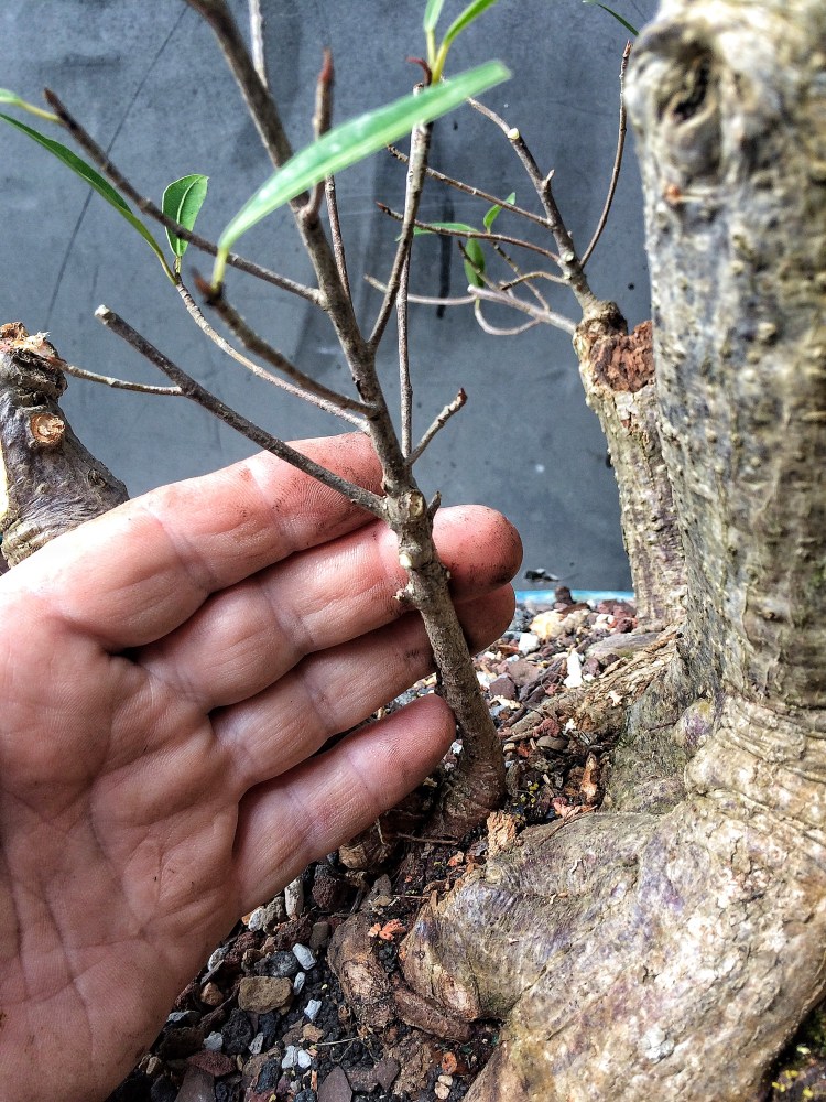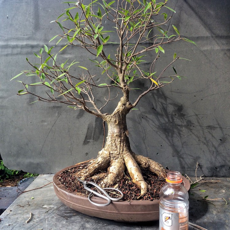 Why, with this tree, should I have been more vigilant? Well, for one, it’s in a bonsai pot. That means bonsai soil. Which means more ramified growth, generally. Secondly, it’s a willow leaf ficus, which means that when you chop it, you don’t get just one new shoot at the top but 20, 30, maybe more. You really need to manage the growth. Which is is where I failed the test.