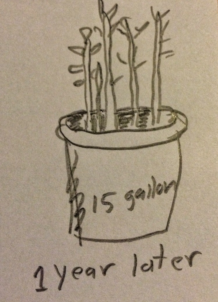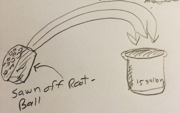 Then, after potting your specimen, instead of throwing away the bottom half of your rootball, stick it back into the old, 15 gallon nursery can.