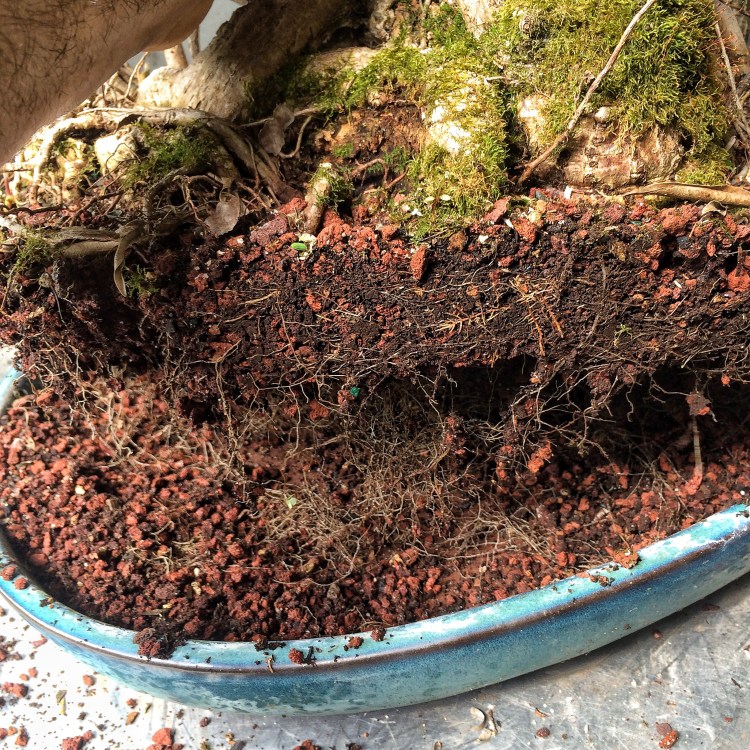 Then we cut the root ball to fit. How much? Enough to go into a bonsai pot (at this point, the trees trunk should be developed to the size you want. Don’t put a stick in a pot, that needs to grow, into a bonsai pot).