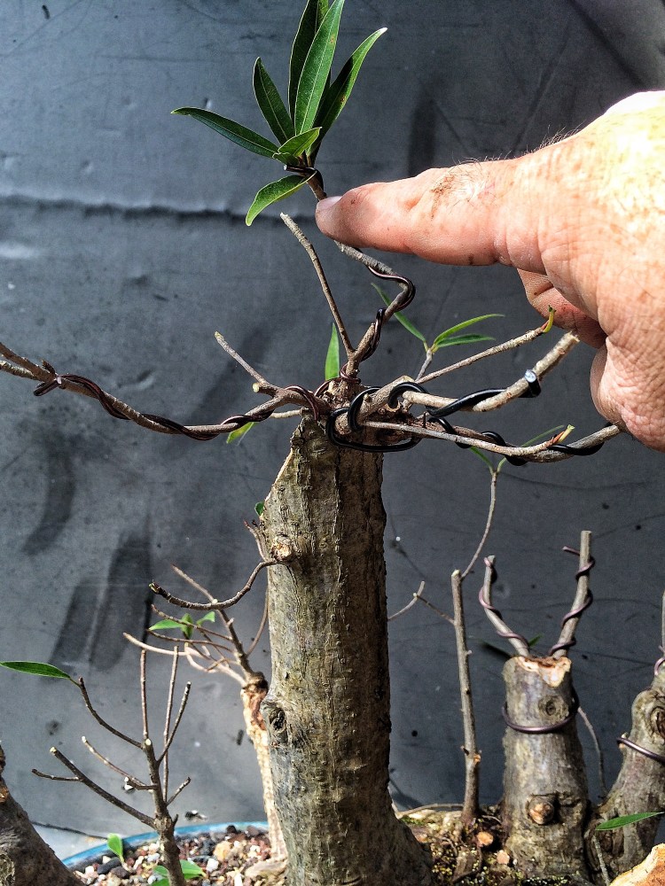I left a stub so I can get two or more shoots, and therefore, more trunks to work with later. And those straight, skinny twigs are bugging me too. I must (I must!) add just a little more wire and…….