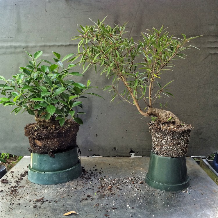 The left hand one is the tree I teased at the end of the Clump style willow leaf fig from a sawn off root ball post. The right hand one was a tree I teased about on Facebook. I was challenged by Seth Nelson (Mr. Melon, as he’s taken to call himself. I call him Spanky, it’s Bohemian for “he who whacks off his trunk”) because he has never seen a semi-cascade willow leaf ficus.