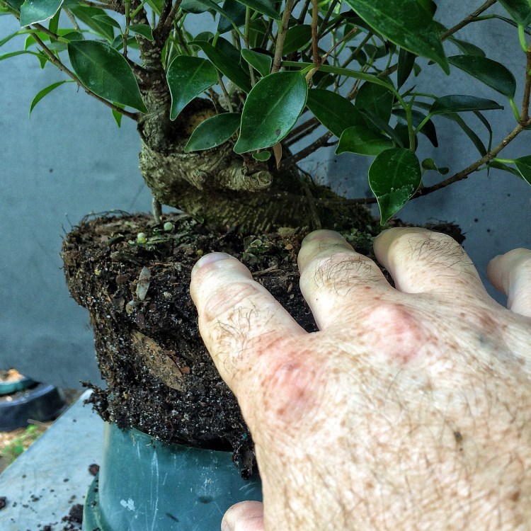 You’ll notice the dieback. Even though it’s a ficus, it will have dieback on smaller branches because it’s a ficus microcarpa (a retusa or tiger bark). That’s just what they do. I’ll be removing most of these bigger branches because they are just about unbendable.