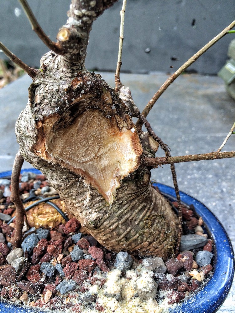 I’ve talked about this before, by shaping the cut like this, it facilitates the healing process and speeds the callus formation. This technique was discovered by the master bonsai growers in Taiwan.