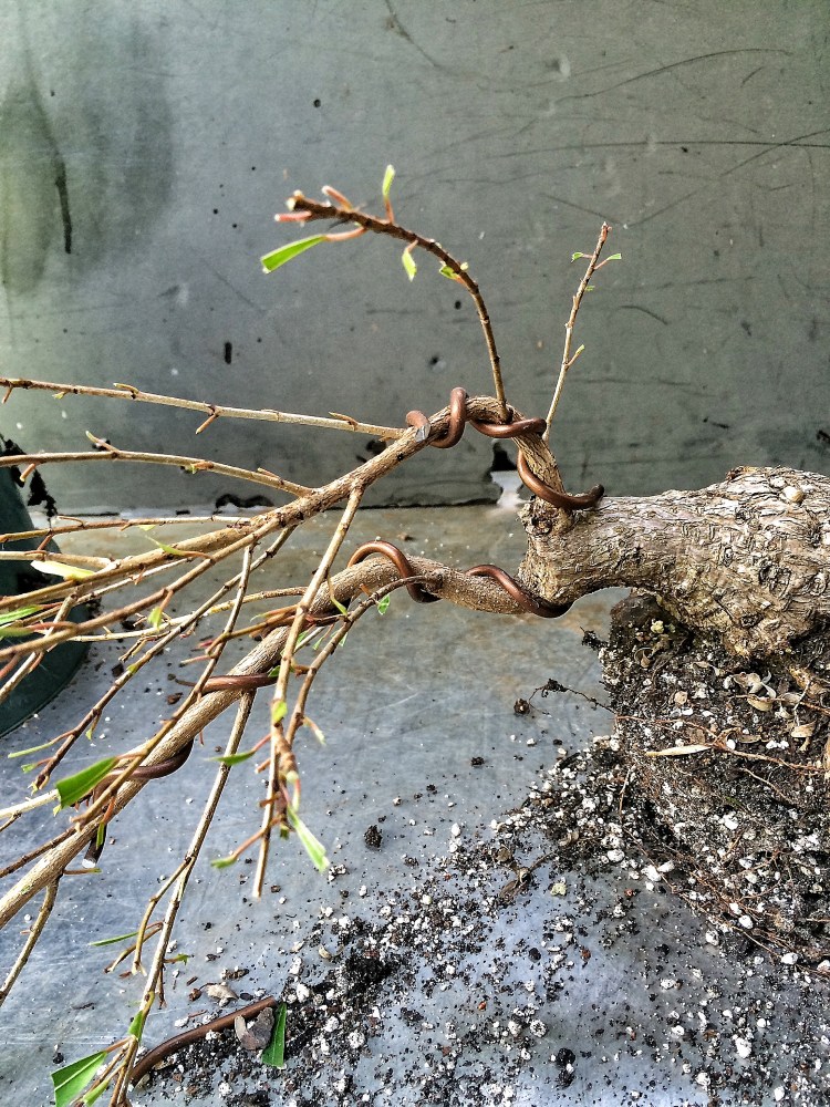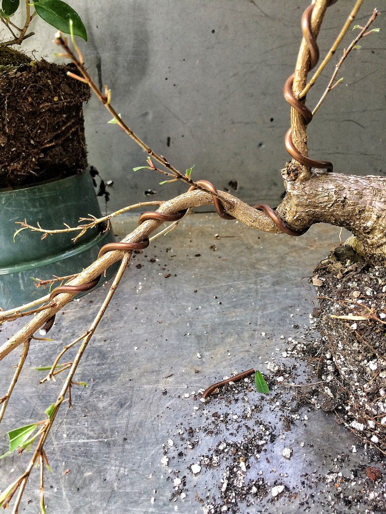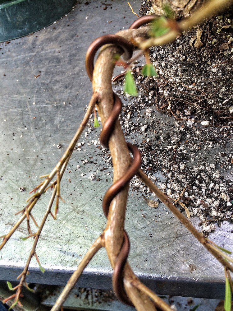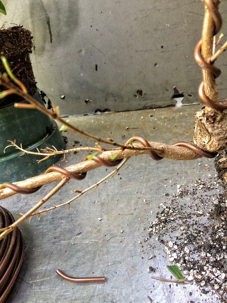 I’m thinking I might need two wraps of the wire to get it to bend. Here’s something funny to contemplate: I’ve heard that if you use too big of a wire on a branch, that you’re apt to break said branch. And I’ve also heard the opposite too, too small a wire will cause you to force the branch too much, thereby cracking it. Additionally, it’s usually recommended that you use just one wire, that is the correct size, to bend a branch.