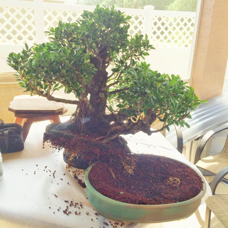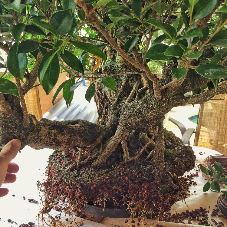 This tree (a ficus microcarpa “retusa” or “tiger bark”) has a secondary trunk growing off the right side (as all good banyans should, really)