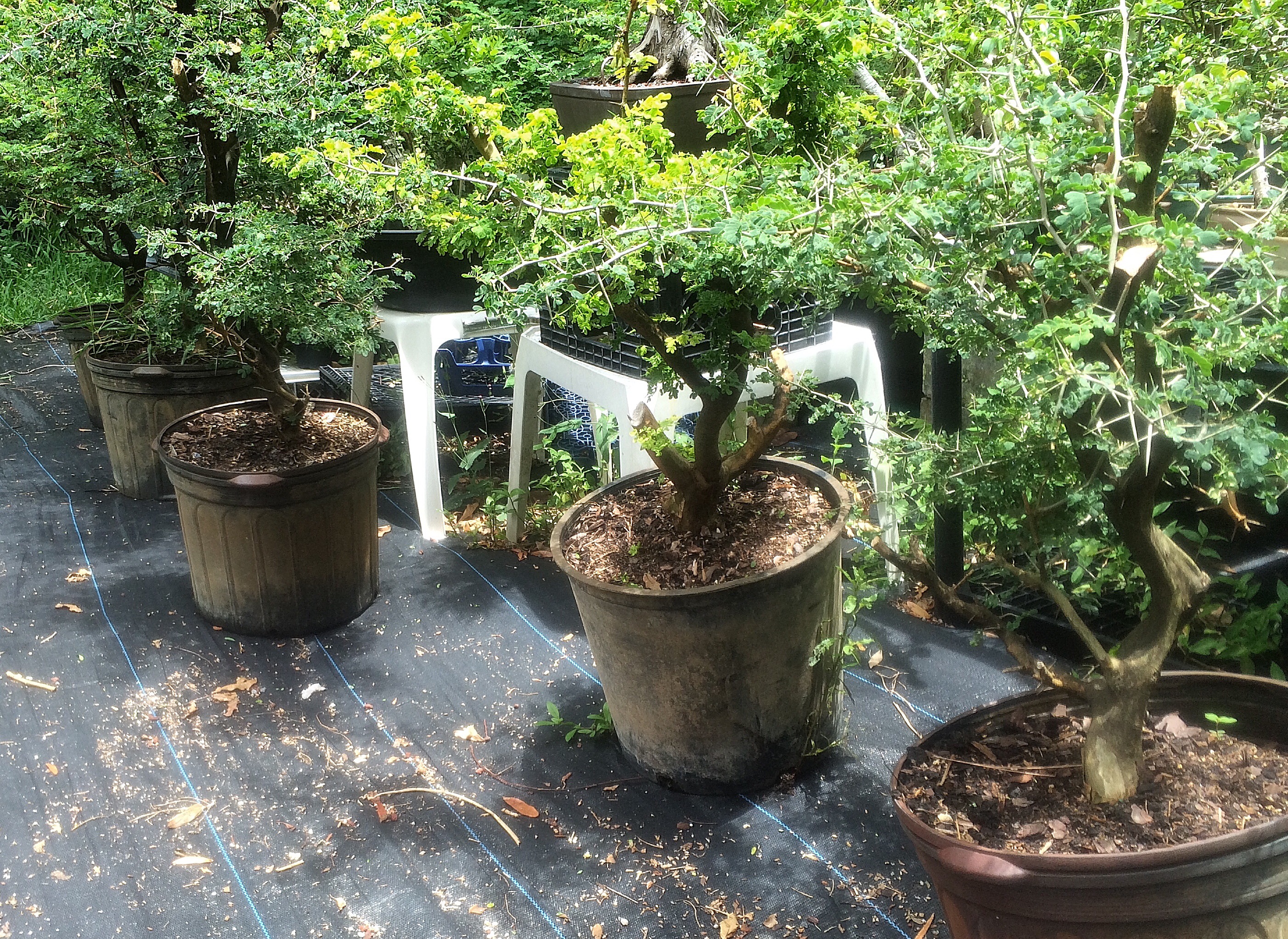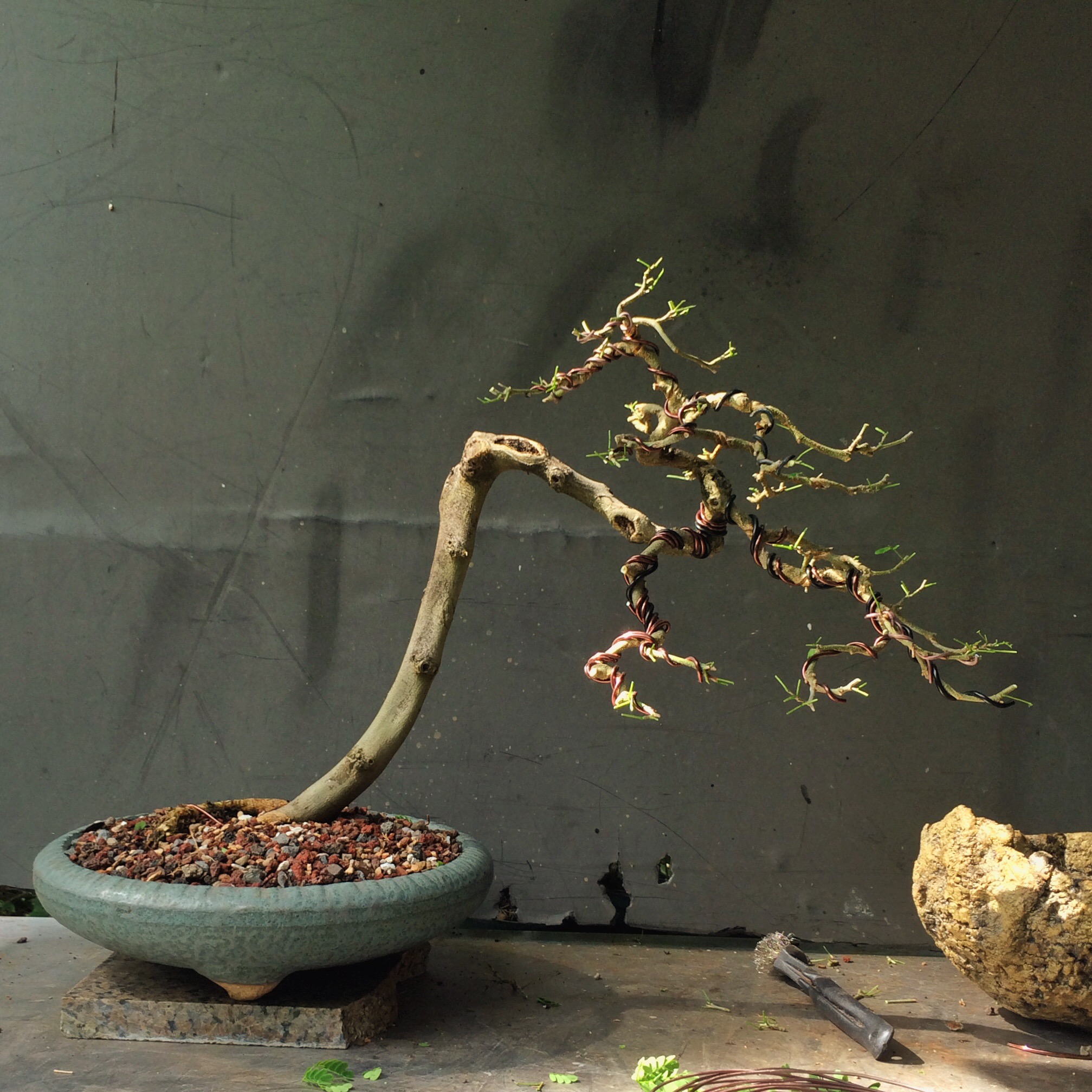 One reason this tree is called a “Raintree” is that, when it rains, it gets pouty, like the above pic. Basically, those leaflets close up during rain (or drought, or wiring/repotting etc. some type of stress) and makes the tree look sad. I’m not sure who I was kidding by leaving those branches in leaf and doing the pruning/wiring. It looks like crap.