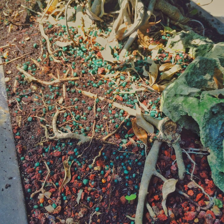 Wow, that seems like a lot of, what I can only call, “green”, fertilizer, but it’s a medium amount. I’ve seen more on other Florida trees. Piles and handfuls. This is conservative compared to that, coming from a Bohemian and all. It is also planted on a rock (which makes it heavy, like a German philosopher’s prose)