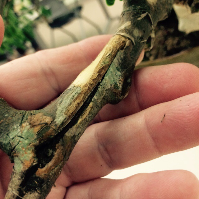 The fall also split the next branch up and Steve (bro in law) wrapped raffia around it to try to save it.